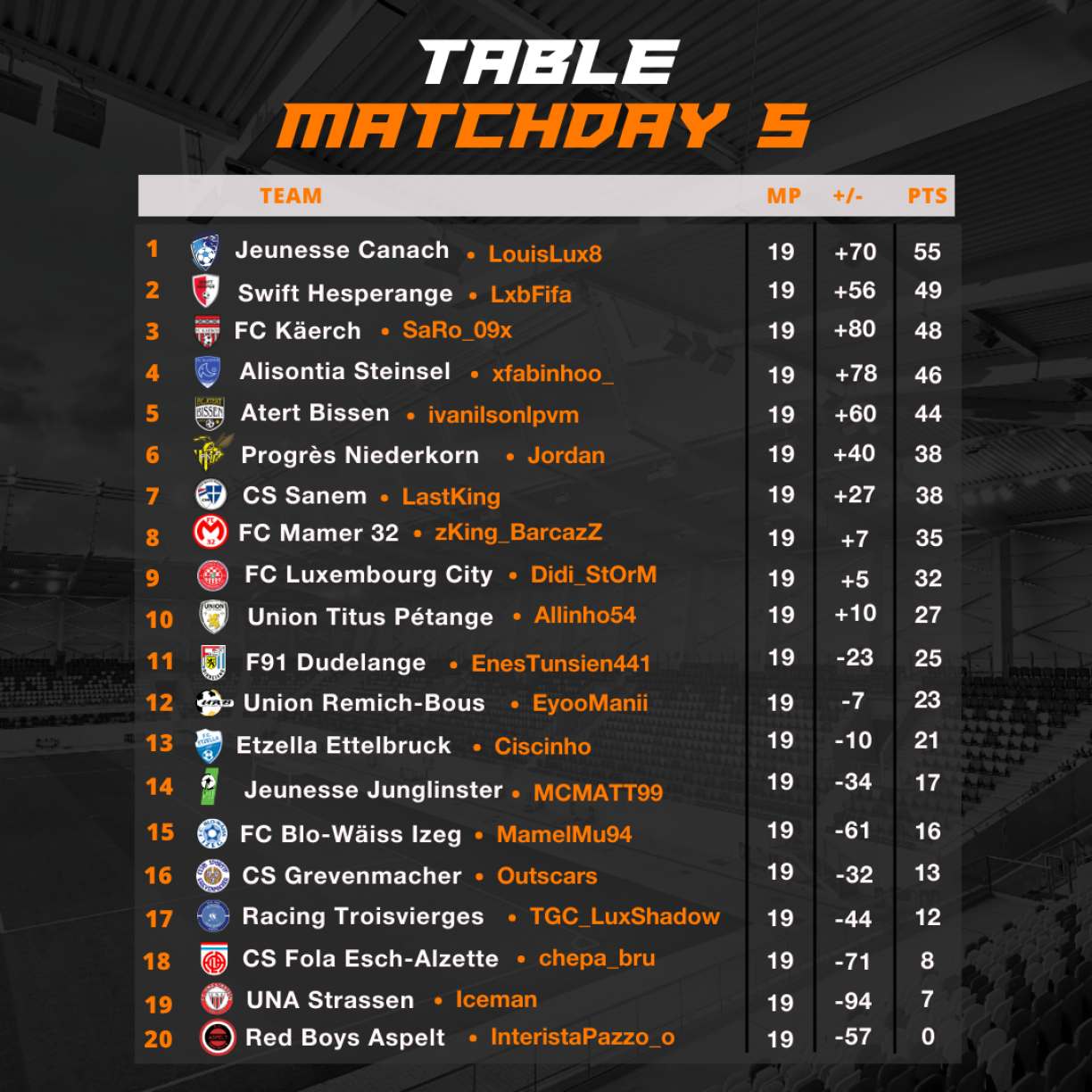 Mat 55 Punkte ka Kanech sech op der 1. Plaz nom 5. Spilldag vun der Orange eLeague behaapten, dat mat engem Virsprong vu 6 Punkten op den Zweetplacéierten Hesper. Op déi 3. Plaz kënnt Käerch mat 48 Punkten, dat mat engem Punkt manner wéi Hesper.