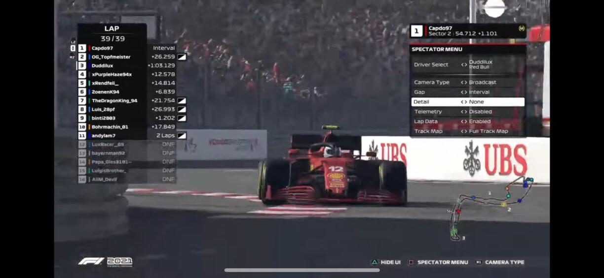 D’Course war dunn awer bëssen méi chaotesch... Den Aiim_Devil hat en freien DNF obwuel hien ganz staark ënnerwee war. Den LuxRacer hat och puer Mol Pech an huet och dowéinst um Schluss den Auto misse stoen loossen.