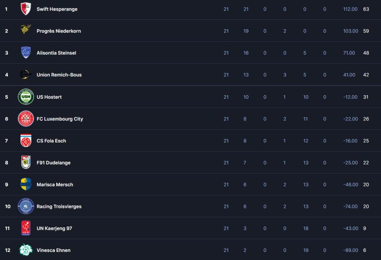De Progrès Nidderkuer ass déi eenzeg Ekipp, déi den Uschloss zum Swift hale kann, wärend d’Plazen 3 bis 6 onverännert bleiwen. D’Union Réimech-Bous konnte sech am Stream live géint d’UN Käerjeng an hiren 3 Matcher duerchsetzen an hunn och am Topmatch géint Marisca Miersch 7 Punkte kënnen huelen.