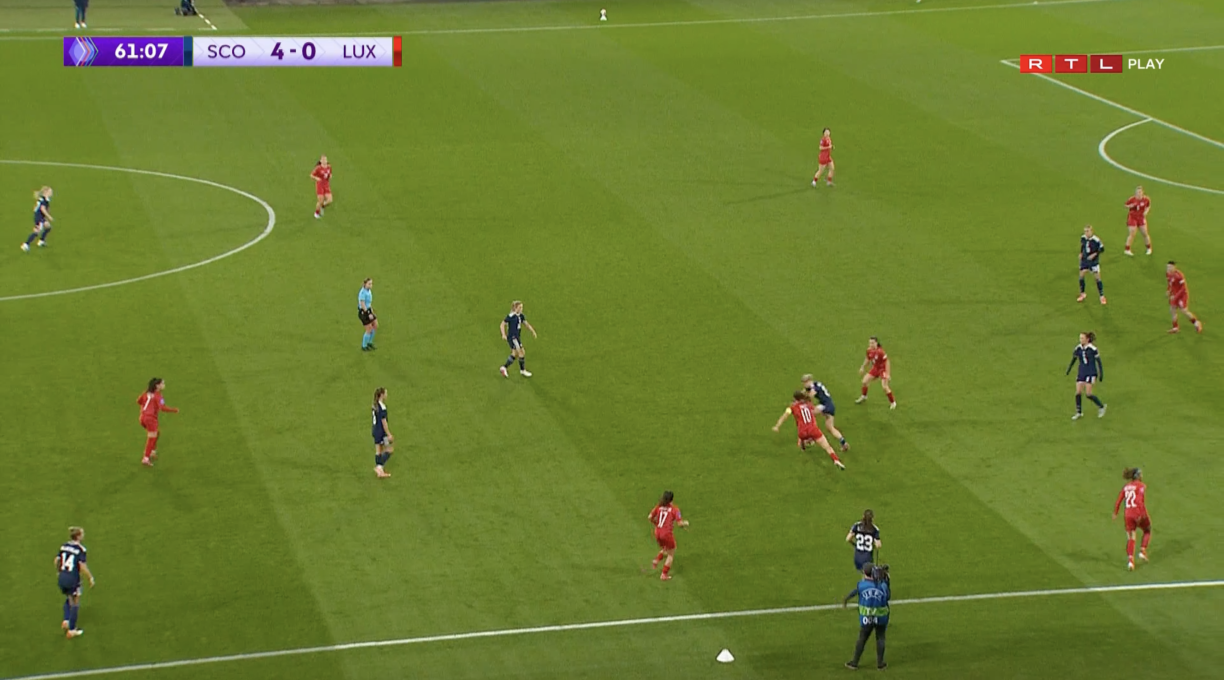 Ënner anerem ouni d’Rekordbuteuse Amy Thompson haten d’Rout Léiwinnen et och auswäerts beim Favorit Schottland schwéier. Schonn no 35 Sekonne hunn d’Schottinne mat zwou gudde Päss de Wee duerch d’Lëtzebuerger Linne fonnt a konnten duerch d’McGovern a Féierung goen. No ronn 9 Minutten huet d’Clark no engem Corner per Kapp den 2:0 fir d’Lokalekipp markéiert. D’Lëtzebuerginne konnt géint e staarke Géigner kaum fir Entlaaschtung suergen, an no enger hallwer Stonn huet d’McGovern mat hirem 2. Gol vum Match fir d’Virentscheedung gesuergt.