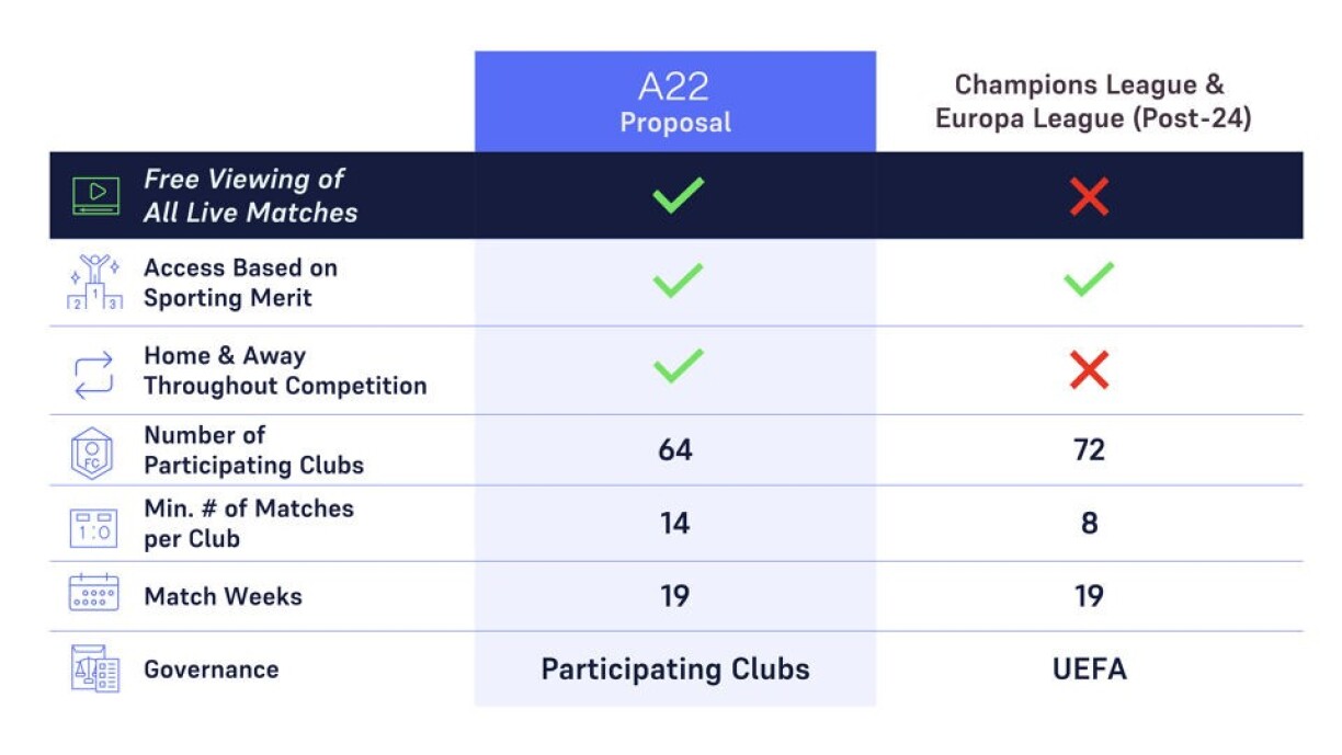 Nodeems den europäesche Geriichtshaff en Donneschdeg de Moien de Wee fir eng Super League theoretesch fräi gemaach huet, huet A22 Sports Management, d’Firma, déi hannert der Super League steet, éischt Pläng bekannt ginn.