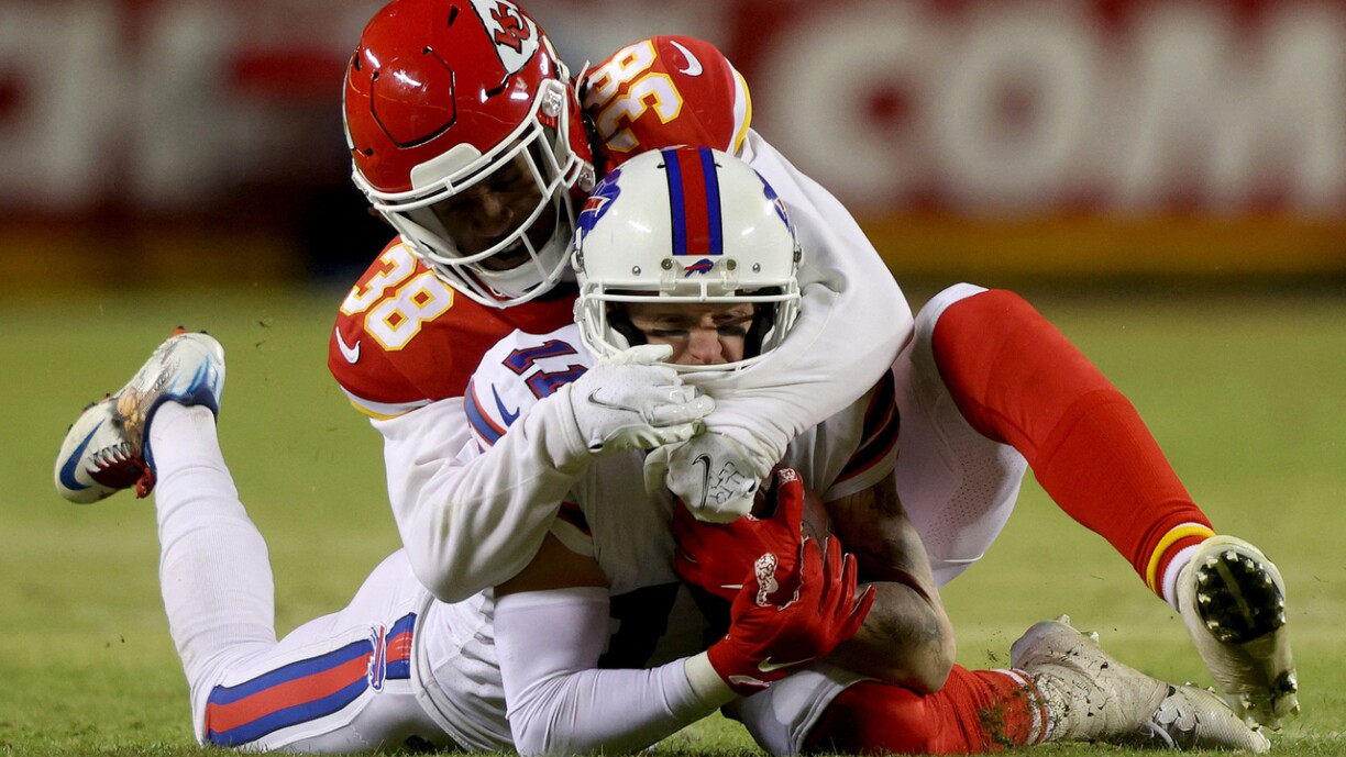 Hei treffe si op d’Kansas City Chiefs, déi sech doheem an Overtime géint d’Bills konnte behaapten. Et war e spektakuläre Match mat richteg staarken offensive Leeschtungen an zwee bal perfekte Quarterbacks. Well esouwuel de Patrick Mahomes wéi och den Josh Allen hunn d’Majoritéit vun hire Passen un de Mann bruecht, hu fir iwwer 300 Yards gehäit an hunn 3 respektiv 4 Touchdowns op de Compte geschriwwe kritt, ouni eng Interception ze geheien. No Stand vu 14:14 an der Paus war kloer, datt et spannend géif ginn. D’Chiefs konnte sech liicht am 3. Quarter ofstëtzen, dee véierte goung awer nees un d’Bills. Spektakulär waren déi lescht 2 Minutten. Et goung hin an hier, Touchdowns Bills, Touchdown Chiefs, Touchdown Bills a Fieldgoal Chiefs esou datt hei ganzer 24 Punkten an esou kuerzer Zäit gefall sinn. An Overtime hunn d’Chiefs de Cointoss gewonnen an hunn als éischt dierften ugräifen. Well si direkt en Touchdown markéiere konnten, war de Match eriwwer, dee si gewonnen hunn.