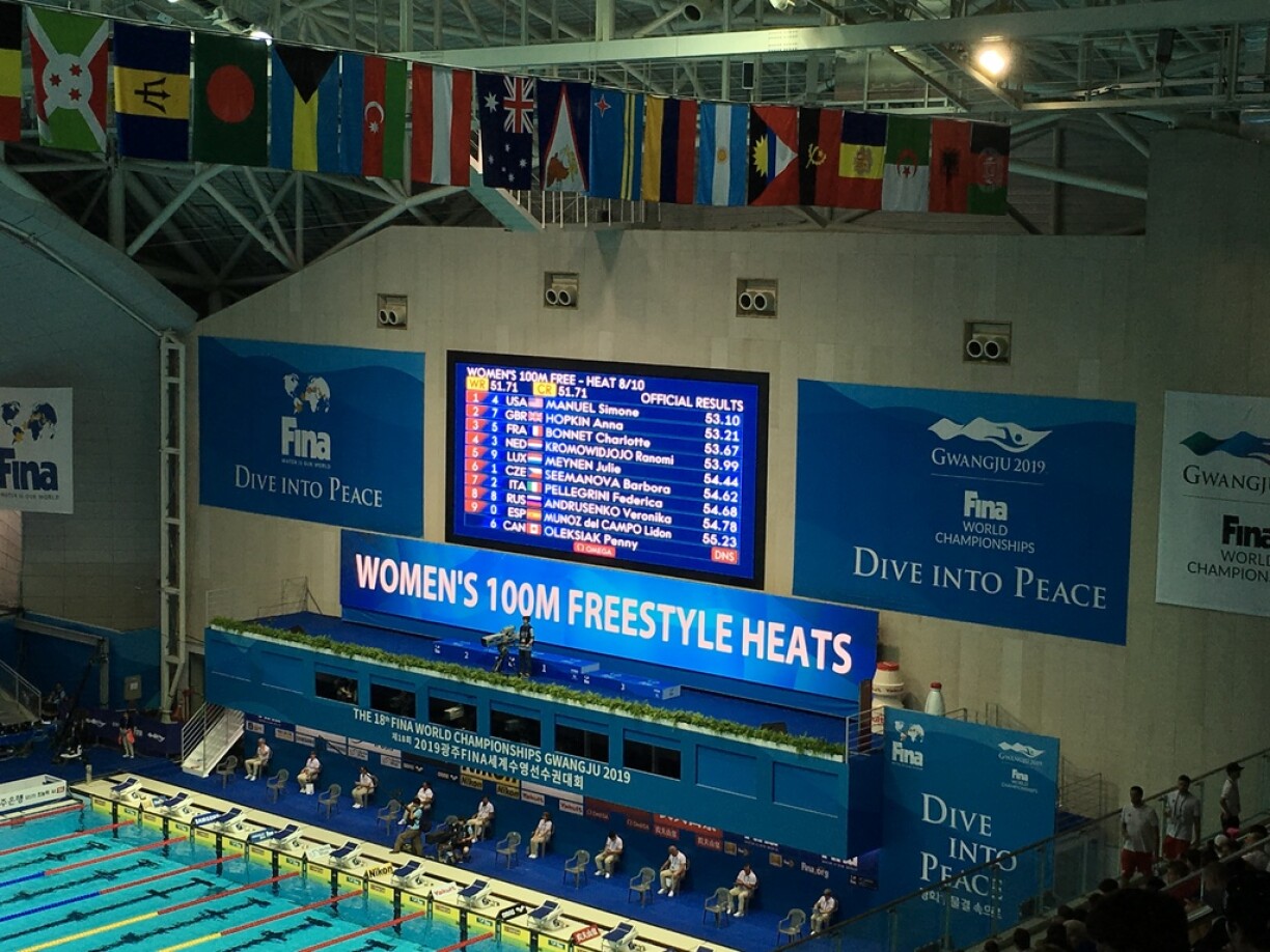 Weider gutt Nouvelle komme vun der Weltmeeschterschaft am Schwammen. Zu Gwangju a Südkorea ass d’Julie Meynen iwwer 100 Meter Crawl een neie Lëtzebuerger Rekord geschwommen. Déi 21 Joer al Schwëmmerin huet no 54 Sekonnen a 44 Honnertstel ugeschloen an hiren eegene Rekord vu virun engem Mount ëm 5 Honnertstel verbessert. D’Julie Meynen huet mat dëser Zäit d’Qualifikatioun fir d’Olympesch Spiller 2020 zu Tokio ëm nëmme 6 Honnertstel verpasst.