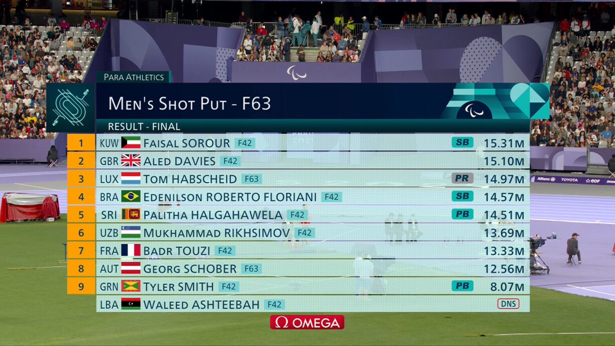 D'Goldmedail war fir de Faisal Sorour aus Kuwait. Am 4. Versuch ass seng Kugel bei 15,31 Meter gelant. De Britt Aled Davies (15,10 Meter) krut d'Sëlwermedail.