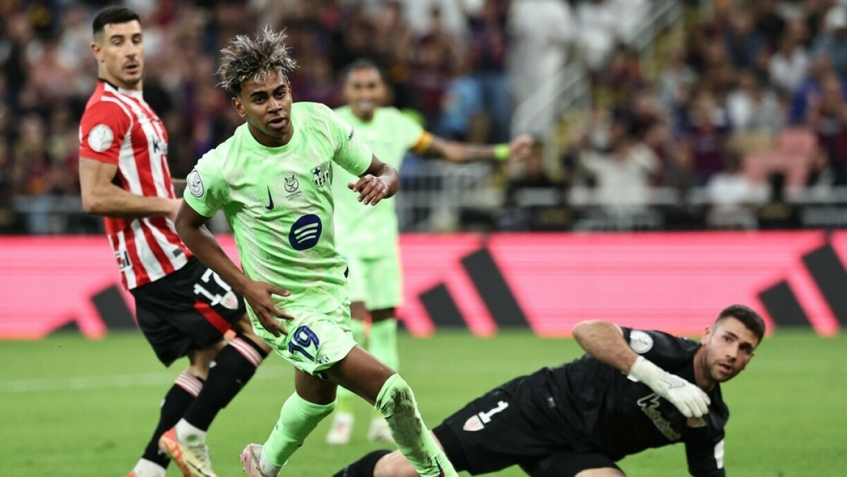 A Spuenien steet den FC Barcelona no enger Heem-Victoire géint Athletic Bilbao an der Finall vum Super Cup. D’Katalane gewannen duerch Goler vum Gavi an der 17. a vum Lamine Yamal an der 52. Minutt. An der Finall, déi e Sonndeg zu Dschidda a Saudi-Arabien gespillt gëtt, trëfft Barca op de Gewënner vum Match tëscht dem RCD Mallorca a Real Madrid