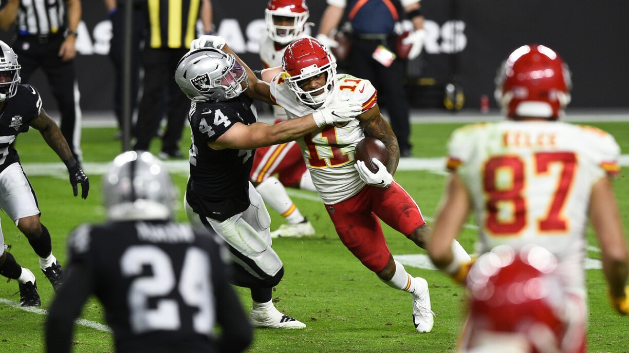 Fir d’Chiefs gouf et dës Saison just eng Néierlag, dat grad doheem géint den Divisional Rival aus Las Vegas. Ma um Sonndeg konnt d’Ekipp aus Kansas City hir Revanche huelen. Et war den ideale Start am Match fir béid Offenses, déi all Kéiers mat hiren éischten zwee Drives en Touchdown markéiere konnten. Esou stoung et am Ufank vum zweete Véierel 14:14. Dono goufen d’Defense besser an am zweete Quarter ass de Raiders nach just ee Fieldgoal gelongen, si sinn also mat engem knappen Avantage vu 17:14 an d’Paus gaangen.
