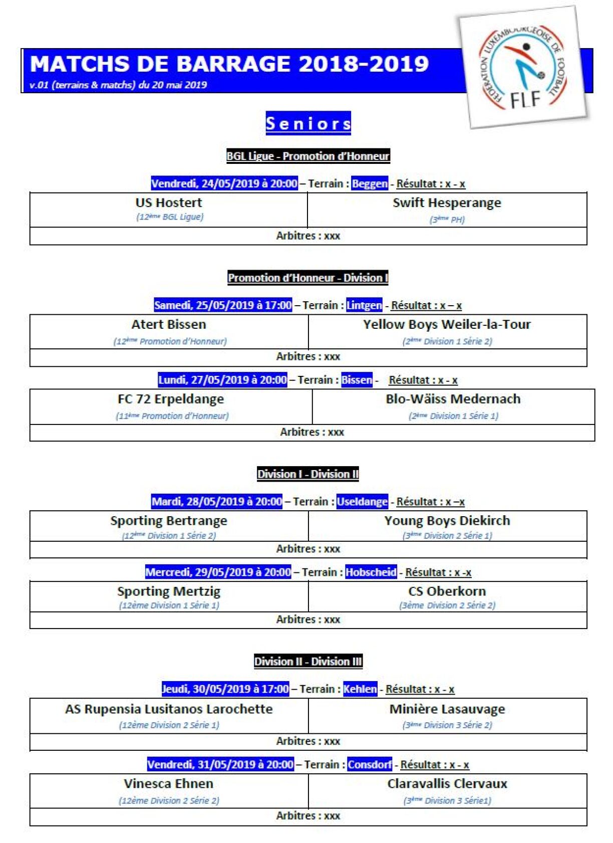 D’FLF huet matgedeelt wou a wéini d’Barragematcher am nationale Futtball sinn. Ëm déi lescht Plaz an der ieweschter Spillklass geet et e Freideg Owend zu Beggen um 20 Auer tëscht Hueschtert an Hesper.