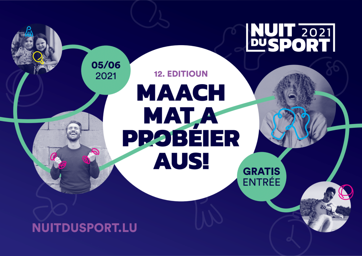 La Nuit du sport, un évènement incontournable dans le domaine du sport-loisir revient le 5 juin 2021 avec sa 12e édition. Après une édition annulée en 2020 - crise sanitaire oblige - l’édition 2021 a été planifiée et mise en œuvre dans une optique d’optimisme et s’annonce dorénavant sportive et variée. L’initiative a été lancée pour la première fois en 2009 par le Service national de la jeunesse (SNJ) et le ministère des Sports (MSP) dans le cadre du plan d’action national «Gesond Iessen, Méi Beweegen» (GIMB). Lors de ce rendez-vous annuel, les communes mobilisent clubs sportifs, commissions des sports, maisons de jeunes et autres associations et structures pour proposer des activités sportives et originales autour de la découverte sportive et du mouvement. Au total 19 communes et autres organisateurs se sont inscrits pour organiser le 5 juin 2021 une soirée inédite autour de la découverte de pratiques sportives sous le slogan «Maach mat a probéier aus!». Du nord au sud, de l’ouest à l’est, le visiteur pourra découvrir un programme sportif dans les localités suivantes: Bettembourg, Bissen, Clervaux, Contern, Feulen, Kayl, Kopstal, Leudelange, Lultzhausen, Luxembourg, Manternach, Mondorf-les-Bains, Pétange, Roeser, Sandweiler, Schengen, Schieren, Schifflange et Schuttrange. Même si le côté festif de l’évènement doit attendre une prochaine édition, des découvertes inoubliables attendent le visiteur cette année: Aikido, Beachvolleyball, Canoë-Kayak, Darts, Escalade, Kan Jam, Kick-Boxing, Nordic Walking, Parkour, Teqball, Zumba ne sont que quelques exemples des activités sportives que le visiteur peut découvrir à cette occasion. Variété et originalité sont au rendez-vous! Informations détaillées, l’intégralité des programmes d’activités et modalités d’inscriptions peuvent être consultées sur le site web officiel: www.nuitdusport.lu |
