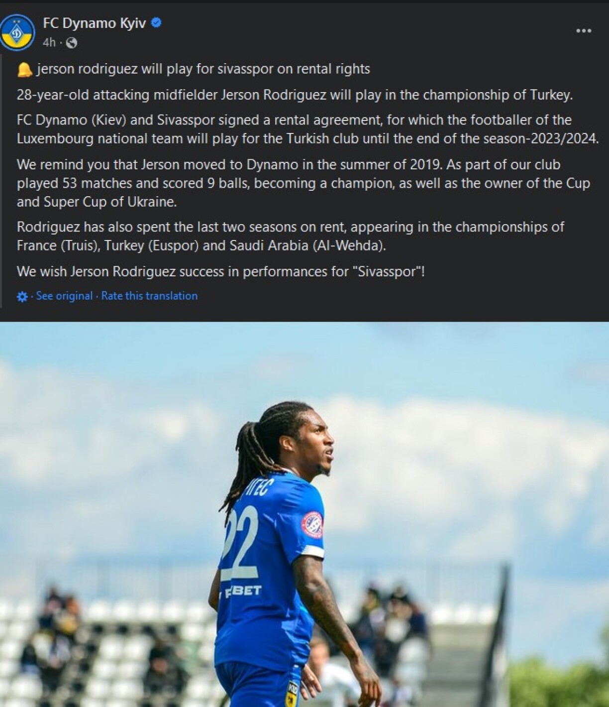 De Gerson Rodrigues gëtt fir ee Joer vun Dynamo Kiev bei Sivasspor ausgeléint, wéi säi Club op Facebook matdeelt. Am Summer 2019 war hien an d’Ukrain bei Dynamo gewiesselt.