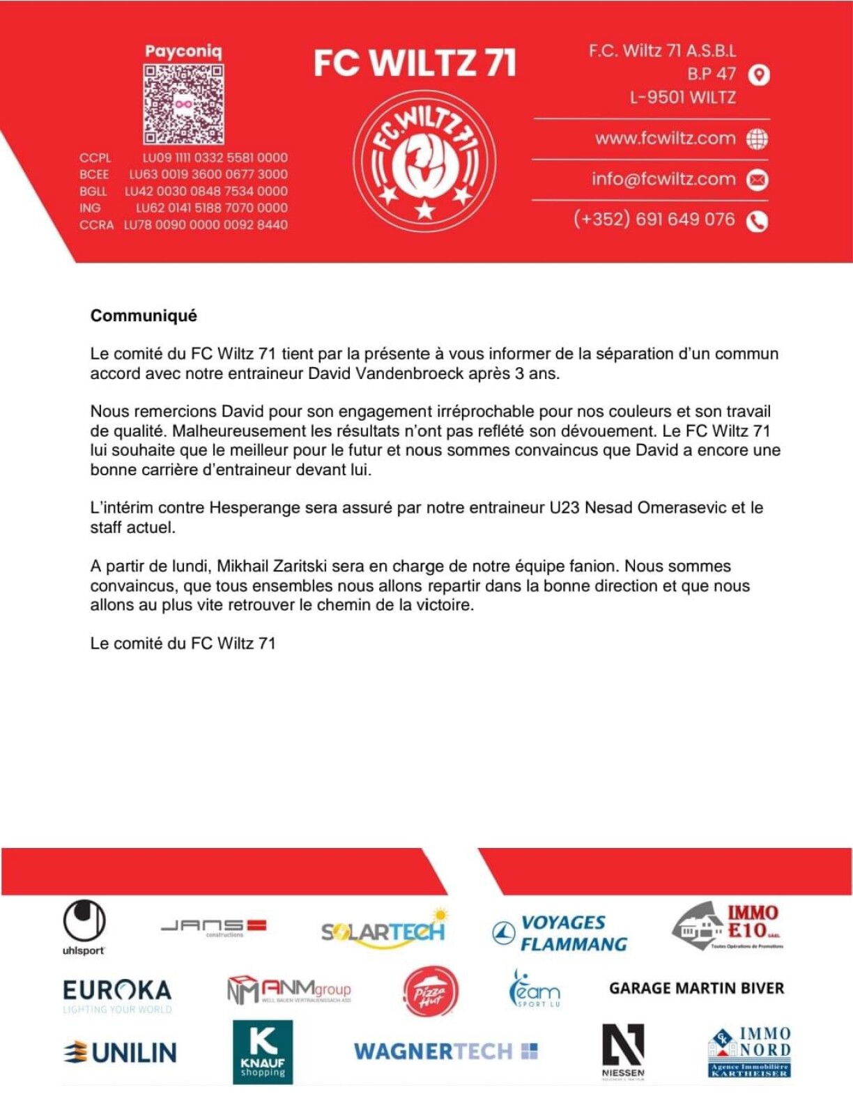 2020 ass den David Vandenbroeck als Spiller op Wooltz gewiesselt. 2021 huet hien den Trainerstull bei de Weeltzer iwwerholl.