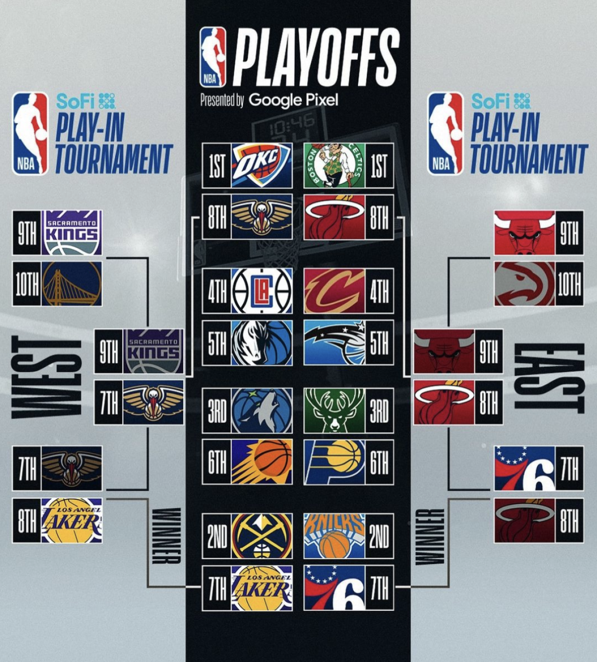 Iwwer déi lescht Deeg hu sech d’Los Angeles Lakers, d’Philadelphia 76ers, d’Miami Heat an d’New Orleans Pelicans déi 4 leschte Startplazen iwwer de “play-in” geséchert. Vun elo u sinn am Osten (Eastern Conference) souwéi am Westen (Western conference) nach jeeweils 8 Ekippe vertrueden, déi an “Best-of-7"-Serië géinteneen untrieden.