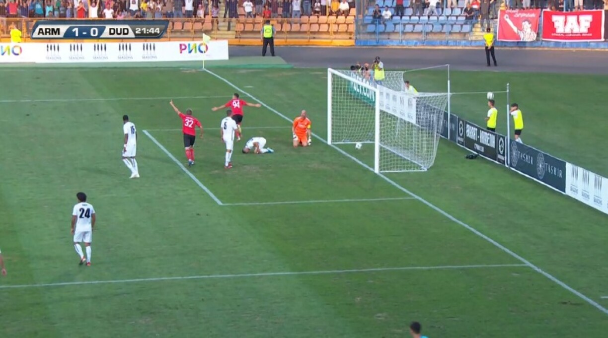Ee Schoss vum Delgado, dee kuerz no der Paus vun der Lat ofgeprallt gouf, huet ausgesinn, wéi wann en hannert der Gollinn opkomm wier. Den Arbitter huet awer weiderspille gelooss. No dem 0:1-Réckstand ass dem F91 duerch den Danel Sinani den 1:1-Ausgläich gegléckt, um Enn gouf et awer eng onglécklech 1:2-Defaite, well den Armenier an der leschter Minutt nach ee Gol gelongen ass.