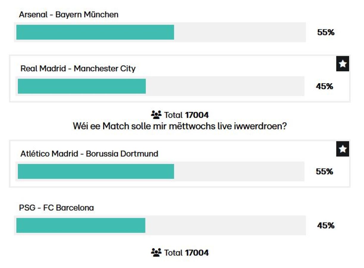 Den 9. Abrëll weise mir de Match Arsenal London géint FC Bayern München (55 Prozent hu fir dee Match gestëmmt an nëmme 45 Prozent fir de Match Real Madrid géint Manchester City). Fir den Dag dono hutt dir Iech fir de Match Atlético Madrid géint Borussia Dortmund decidéiert.