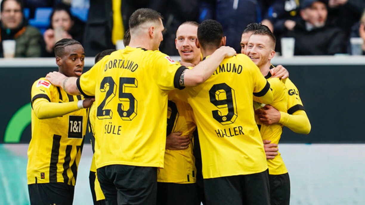 Hoffenheim verléiert 0:1 géint Dortmund, woumat de BVB bis e Sonndeg mat 3 Punkten Avance un der Spëtzt läit. D’Visiteuren haten am éischten Duerchgang ëmmer nees gutt Chancen op d’Féierung, fir déi de Brandt du kuerz virun der Paus mam Réck suerge konnt. No enger knapper Stonn gouf dunn ee Gol vum Wolf wéinst engem Foul am Virfeld vum Gol oferkannt. Doropshin ass Hoffenheim déi besser Ekipp ginn an hat eng Partie gutt Chancen op den Ausgläich, ma um Enn sollt et bei der knapper Néierlag bleiwen.