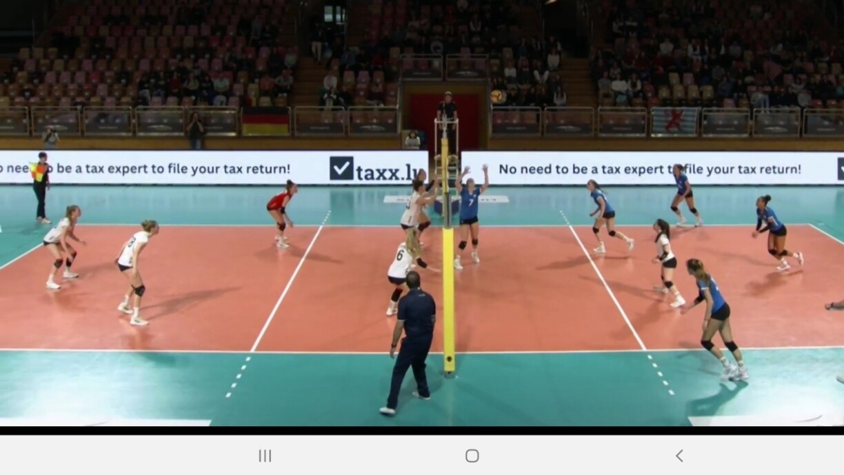 D’Rout Léiwinne sinn nervös an d’Partie gestart a ware beim 7:10 mat 3 Punkten hannen. An der Suite ass et am Ugrëff besser gelaf a Lëtzebuerg huet sech beim 15:11 mat 4 Punkten ofgesat. Um Enn goung den éischte Saz mat 25:20 u Lëtzebuerg. Am 2. Saz war de Verlaf genee ëmgedréint wéi am éischten. D’Heemekipp goung mat 10:7 a Féierung, éier Däitschland den Tempo erhéicht huet a mat 25:21 d’Iwwerhand behalen huet. An der Suite war d’Heemekipp nees dominant a konnt den 3. Saz mat 25:18 fir sech entscheeden. An der 4. Manche war den Ufank ausgeglach a keng Ekipp konnt sech ofsetzen. Nom 10:10 ass déi jonk däitsch Ekipp liicht agebrach. Um Enn huet sech Lëtzebuerg dee Saz mat 25:18 an domadder och d’Schlussvictoire am Novotel Cup geséchert. Däitschland konnt sech iwwer déi 2. Plaz an der Tabell freeën.