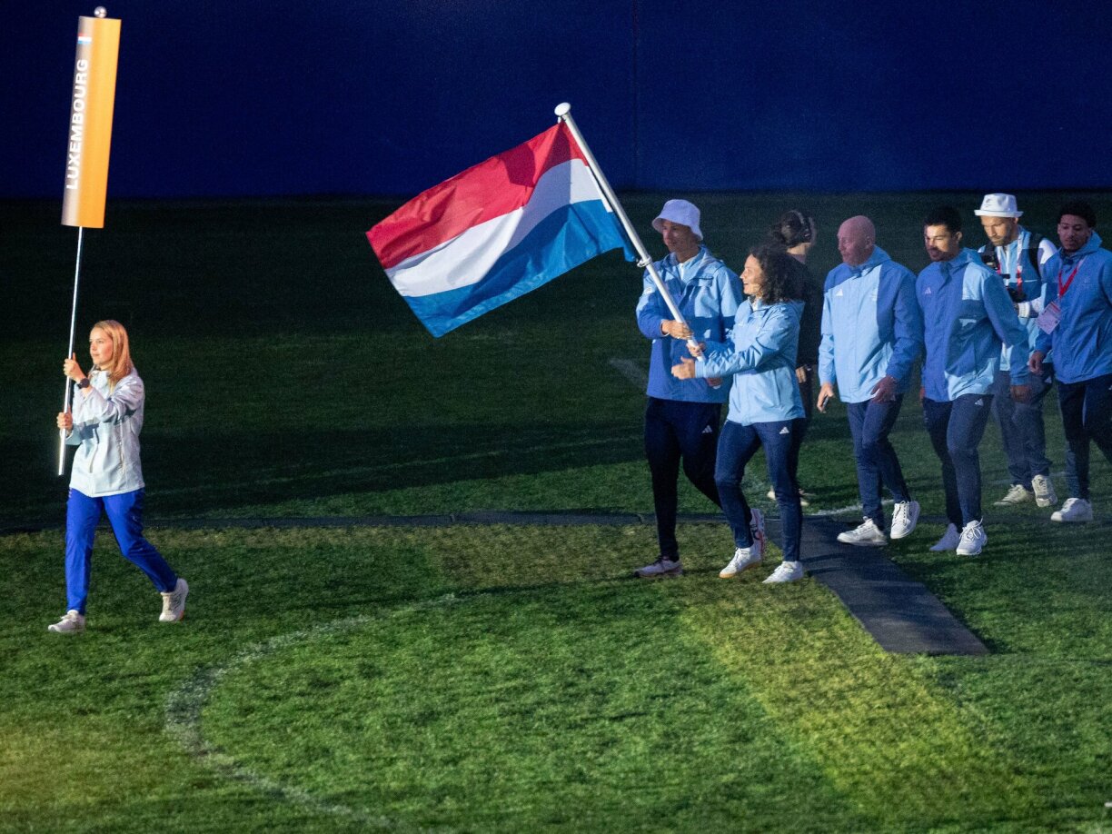 Direkt am Ufank vun der Erëffnungszeremonie sinn d’Delegatiounen an den nationale Futtballstadion erakomm. Als Drëtt war et um Team Lëtzebuerg, ugefouert vun den houfrege Fändeldréier Alex Kirsch a Magaly Meynadier.