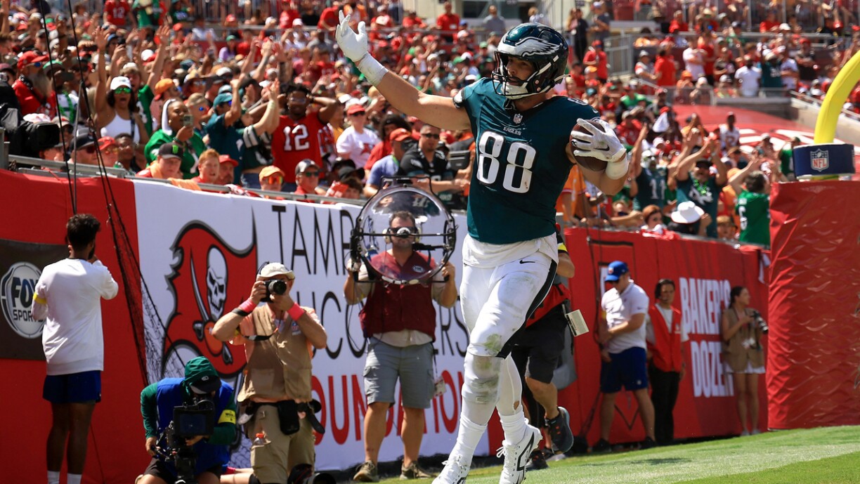 Bei der Partie tëscht de Buccaneers an den Eagles, béid bis ewell ongeschloen, sinn dann direkt zwou “Streaks” gebrach. De Quarterback aus Tampa Baker Mayfield huet seng éischt Interception fir dëst Joer gehäit an hien huet et net fäerdeg bruecht, de Match an der leschter Sekonn vun der Partie ze dréinen. Dat war him déi lescht dräi Matcher gekléckt. An der éischter Hallschent hat u sech alles no enger einfacher a klorer Victoire vun den Eagles ausgesinn, déi mat 24:6 op den Téi gaange sinn. Ma d’Bucs koume mat de Messer tëscht den Zänn aus der Vestiairen. Hir Defense huet just nach een Touchdown zougelooss an d’Offense huet mam éischten eegene Ballbesëtz méi Punkte gemaach, wéi an der ganzer éischter Hallschent. Tampa koum doheem lues awer sécher un d’Eagles erun a mat nach 11 Minutten op der Auer, wier nach alles dra gewiescht. Ma an deem Drive huet de Mayfield seng éischt Interception an der Endzon gehäit. Amplaz gläichzezéien, kruten d’Eagles de Ball. Ma d’Defense vun de Bucs war nees do a konnt verhënneren, datt d’Eagles iwwer den Terrain marschéieren. Hir Ekipp krut de Ball nach eemol erëm, ma och dee Versuch blouf ouni Punkt. Esou konnten d’Eagles de Match auslafe loossen an huelen d’Victoire mat heem.