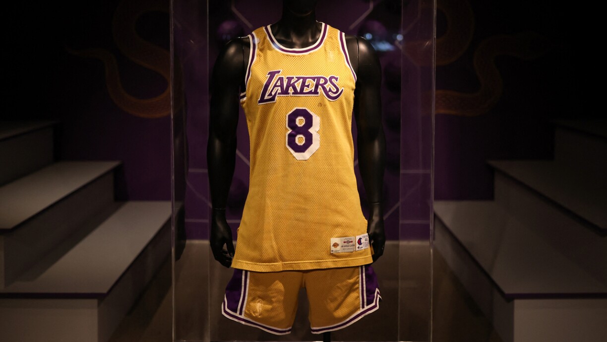 Et handelt sech ëm en Trikot vun de Los Angeles Lakers aus Mëtt der 1990er Joren, mat der Nummer 8 drop.