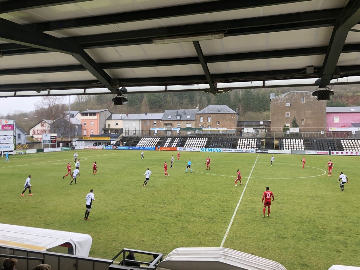 D’Ufanksphas war ausgeglach a keng Ekipp wollt fréi ze vill Risiko goen. Op der hallwer Stonn, e bësse géint de Spillverlaf, war et dunn awer den 1:0 fir d’Doyenne, dat no enger gudder Aktioun vum Stefano Bensi. De Lëtzebuerger Nationalspiller konnt seng Faarwe mat engem Schoss a Féierung bréngen. Dëse Gol huet de Péitenger net guttgedoen, hire Spillopbau huet ënnert dem Réckstand gelidden. 1:0 fir d’Gäscht an der Paus.