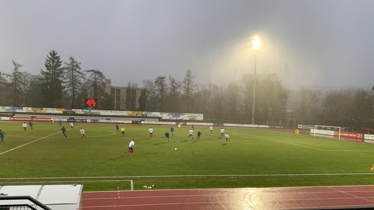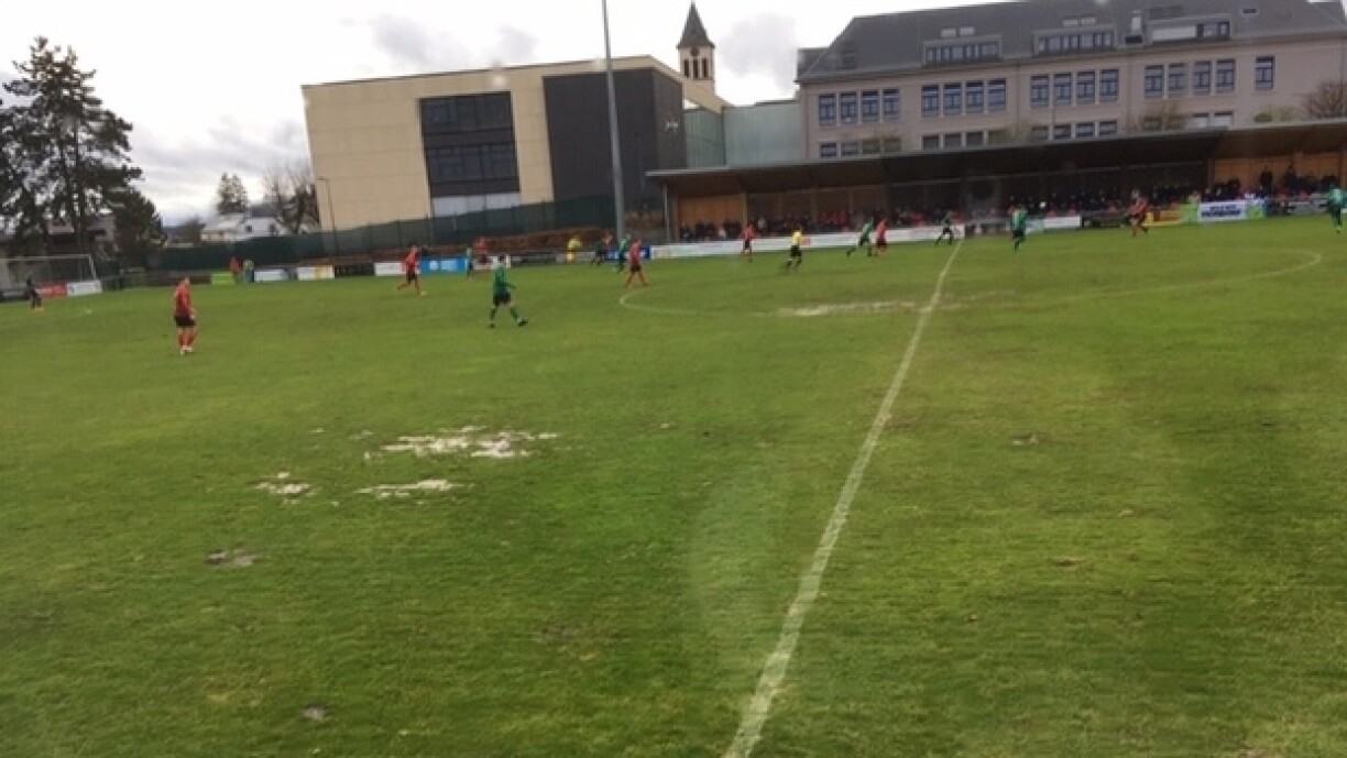 Bei schwierege Wiederkonditioune wollt sech d’Lokalekipp mat dräi Punkten un d’Spëtzt vun der Tabell setzen. Déi éischt Minutte stoungen allerdéngs ënnert kengem gudde Stär. Duerch de staarke Wand gouf d’Partie no nëmme 9 Minutte kuerz ënnerbrach, den Här Torres als Offiziellen huet no ronn 10 Minutten awer decidéiert, de Match erëm unzepäifen.