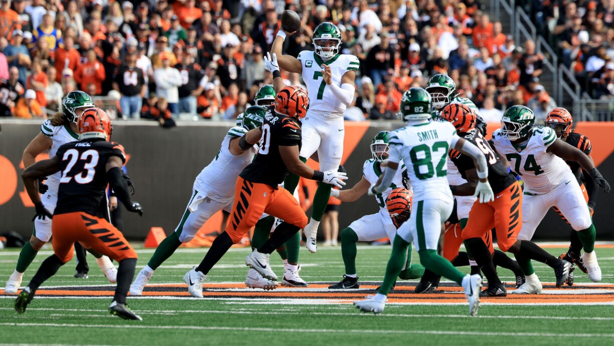 Nom aachte Spilldag gëtt et an der NFL keng Ekipp méi, déi nach kee Match konnt gewannen. Den Jets ass mat engem staarke leschte Véierel et gelongen, eng u sech scho bal verluer gegleefte Partie nach ze dréinen. Well de Start zu Cincinnati war fir d’New Yorker alles anescht, wéi ideal. Nom éischte Véierel war een nees 10:0 hannen. Am zweeten Quarter krut een dann zwar selwer Punkten op d’Tafel, ma d’Heemekipp konnt hiren Avantage weider ausbauen, dat op 24:13. Um Enn vum drëtte Quarter stoung et esouguer 31:16 fir d’Bengals. Ma dunn ass eppes bei de Spiller vun den Jets erwächt, déi net schonn nees als Loser vum Terrain wollte goen. Hir Defense stoung an de leschte 15 Minutten, si hunn een Touchdown zougelooss, an hirer Offense sinn hei eleng 23 Punkte gelongen. Mat nach zwou Minutte viru Schluss konnten d’Jets 39:38 a Féierung goen an nees duerch eng gutt Aarbecht vun hirer Defense, déi och an de leschte Matcher scho staark war, dat Resultat iwwert d’Zäit bréngen.
