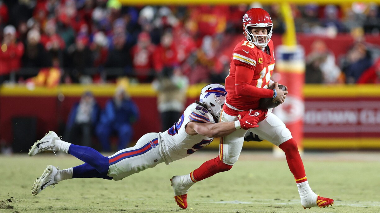 Méi interessant war d’Partie vun der AFC, well do goung et ëmmer nees hin an hier. Déi éischt Hallschent hat kloer de Kansas City Chiefs gehéiert, déi si mat 21:16 fir sech entscheet hunn. Den drëtte Quarter dogéint si wéineg Punkte gefall, keng bei den Chiefs mä dofir 6 bei de Buffalo Bills. Dat ass also duergaangen, datt si d’Partie konnten dréinen a mat 22:21 an déi lescht Minutte gaange sinn. Do awer sollten d’Chiefs Blat nees dréinen a si mat engem Touchdown plus Two-Point-Conversion nees 7 Punkten a Féierung gaangen. No awer grad emol véier Minutten hunn d’Bills nees ausgeglach. Dono huet d’Defense vu Buffalo de Patrick Mahomes a seng Chiefs aus der Endzon erausgehalen a “just” e Fieldgoal zougelooss. Mat awer nach dräi Minutten a 37 Sekonnen haten d’Bills duerchaus nach d’Chance, fir auszegläichen oder esouguer a Féierung ze goen. Ma och hei war d’Defense vum Géigner do. Mat nach 2 Minutten op der Auer haten d’Bills beim véierte Versuch nach 5 Yards ze goen, dat an der eegener Hallschent. Si sinn de Risiko agaangen an hunn et probéiert, et ass hinnen awer net gelongen. Esou hunn d’Chiefs de Ball zeréckkritt an hunn d’Zäit auslafe gelooss. Si wanne zum Schluss verdéngt eng enk a spannend Partie.