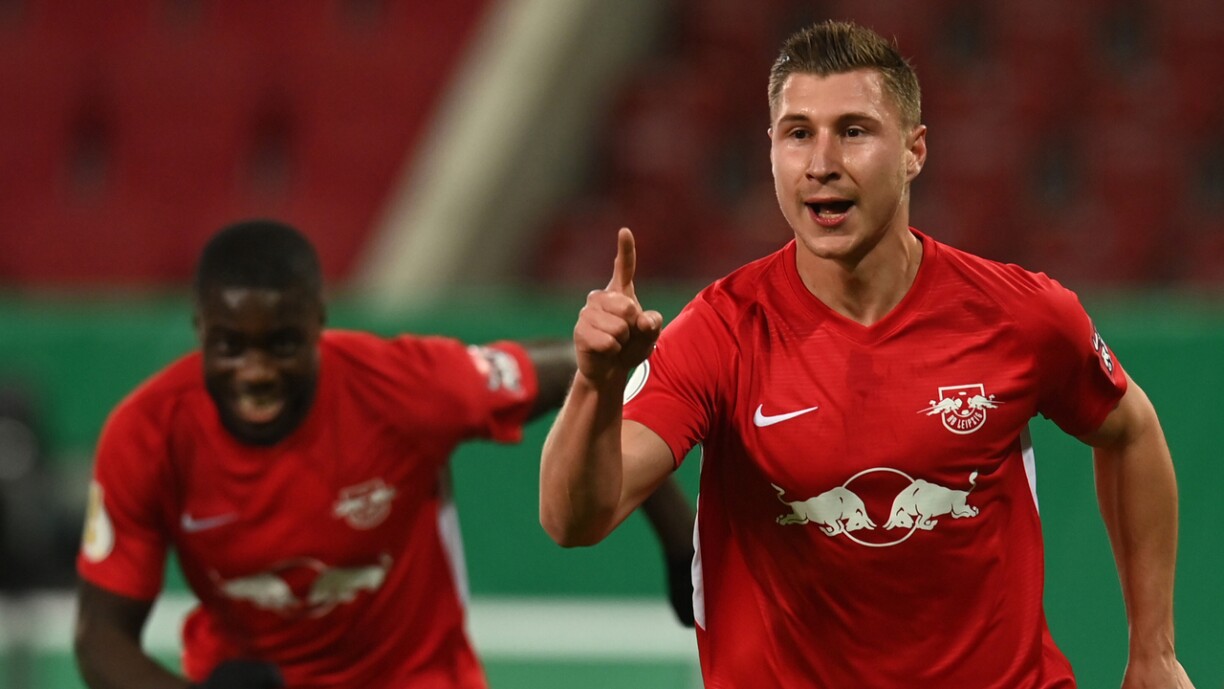 Am Duell vun de Bundesligaekippen huet e fréie Gol de Favorit aus Leipzig a Féierung bruecht. No engem Corner vum Angelino haten d’Verteideger vun Augsburg den Organ net op der Rechnung an hie koum zimmlech fräi op 6 Meter zum Kappball an huet dem Gikiewicz keng Chance gelooss. Iwwerhaapt huet Leipzig déi éischt Hallschent dominéiert, mat 68 Prozent Ballbesëtz an 12 zu 1 Ofschlëss, ma vill méi konnte si aus hirer Iwwermuecht net maachen.