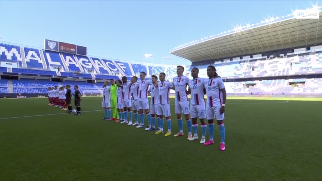 Am Stadion La Rosaleda zu Malaga huet een an der Ufanksphas zwou Ekippen op Aenhéicht gesinn. Laang Zäit war zemools am leschten Drëttel awer net all ze vill lass. Déi bescht Chance op den 1:0 haten d’Rout Léiwen 10 Minutte virun der Paus, ma de Kappball vum Olivier Thill huet de Gol knapps verfeelt. Alles an allem ass vun Norwegen am Spill no vir ze wéineg komm a sou ass déi éischt Hallschent ouni Goler op en Enn gaangen.