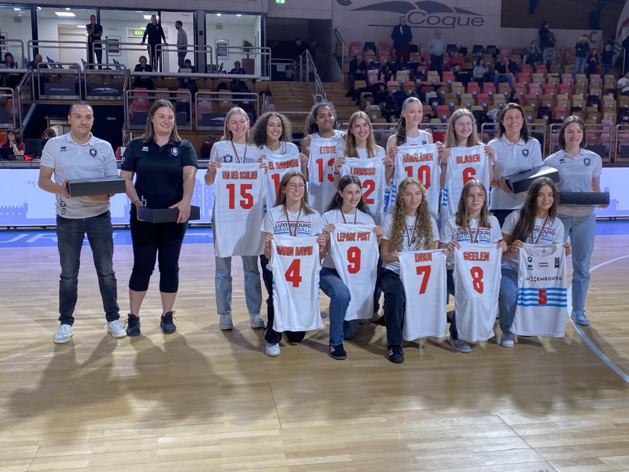 An der Paus vum Match goufen d’U18-Meedercher vun der FLBB geéiert, dat well si bei der U18-Europameeschterschaft am Summer déi zweete Plaz vun der Divisioun B areecht hunn.