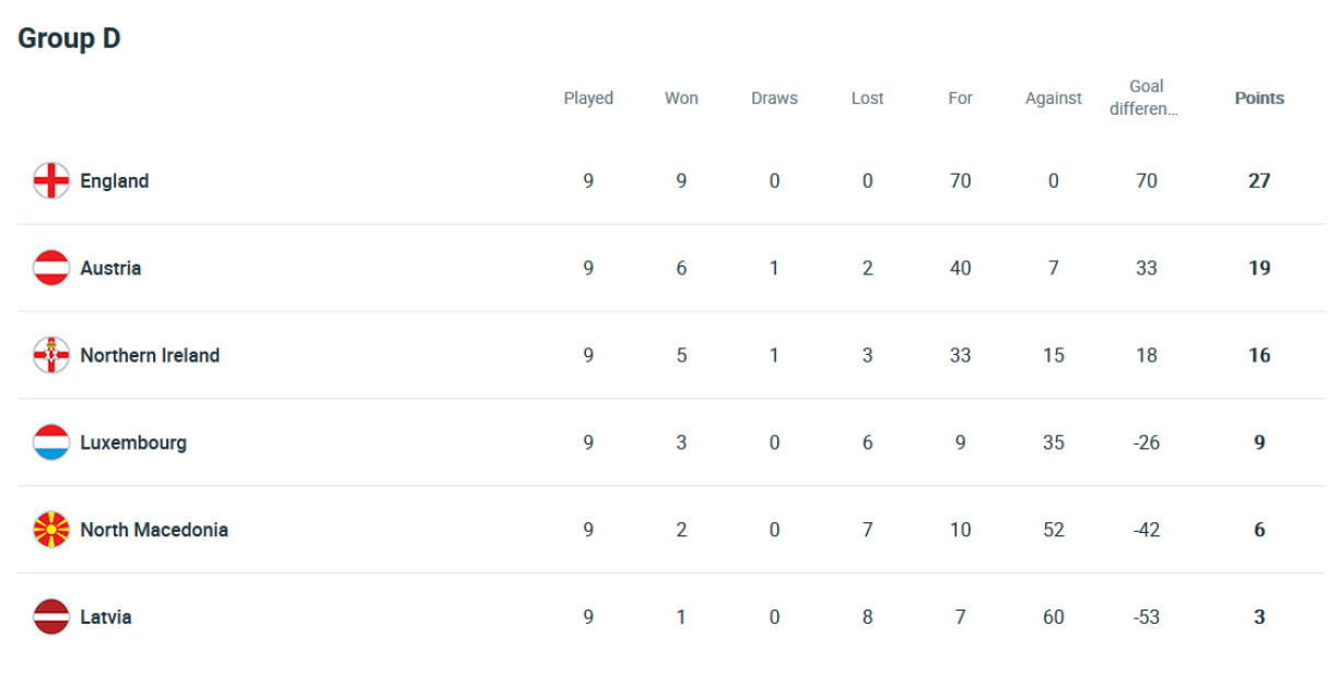 D’Englännerinnen hunn déi éischt 9 Matcher an der Qualifikatioun alleguer gewonnen a sti mat enger Goldifferenz vu 70:0 souverän als Gruppenéischten un der Tabellespëtzt.