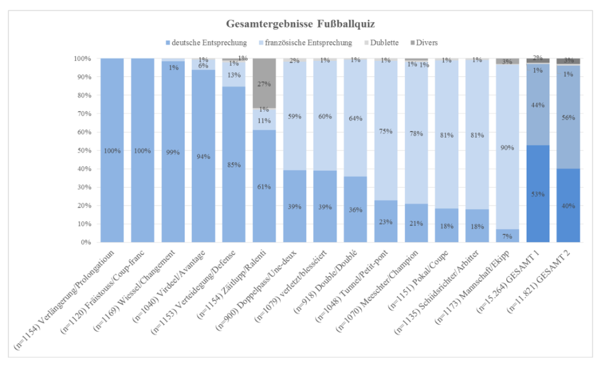 Iwwer 1.200 Leit aus allen Altersgruppen a Regiounen hu matgemaach. Si missten an engem Quiz bestëmmte Begrëffer fannen (Wéi heescht de Mann mat der Päif?) oder tëscht zwou méiglechen Optiounen (Sot Dir Arbitter oder Schidsriichter?) wielen. De Sproochmates huet dës Begrëffer du matenee verglach a sech dobäi virun allem fir lexikalesch Dubletten ewéi eeben Arbitter/Schidsriichter oder Une-Deux/Doppelpass intresséiert.