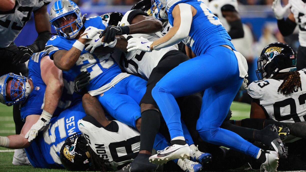 Et kann ee scho bal vun “deklasséiert” schwätzen, wann een d’Partie vun den Detroit Lions géint d’Jacksonville Jaguars wëll resuméieren. Am Duell vun de Wëllkaze war quasi just eng Ekipp um Terrain, déi Hellblo aus Detroit. Dobäi waren den Jaguars direkt am éischten Drive d’Hallschent vun hire Punkte gelongen, dat duerch e Fieldgoal. Dëst konnte si am zweete Véierel nach eng Kéier widderhuelen. Fir de Recht dann dës Zuele vun de Lions: Den Jared Goff huet 24 vun 29 Bäll un de Mann bruecht, dat fir 412 Yards a véier Touchdownen. Dobäi koumen d’Runningbacks Montgomery a Gibbs och nach zesummen dräi Mol an d’Endzon fir sechs Punkten. Rechent een alles zesummen, och nach all Extrapunkt en ee Fieldgoal vun hirem Kicker, hunn d’Lions de sechs vun den Jaguars ganzer 52 Punkten dogéint gesat.