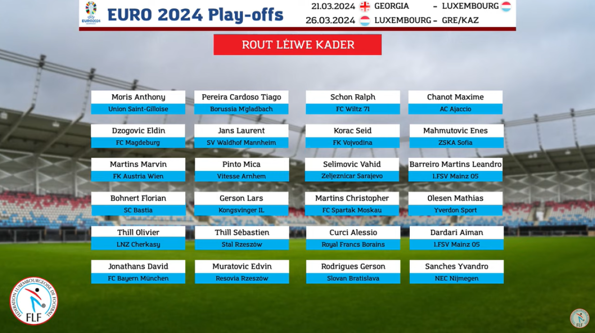 Den nächsten Donneschdeg spillen d’Rout Léiwen zu Tiflis a Georgien. Dënschdes de 26. Mäerz dann hei am Stade de Luxembourg géint Griicheland oder Kasachstan, sollt een den éischte Match a Georgien gewannen. Ginn déi zwee Matcher gewonnen, dann ass Lëtzebuerger fir eng éischte Kéier iwwerhaapt op enger Futtball-Europameeschterschaft mat dobäi.