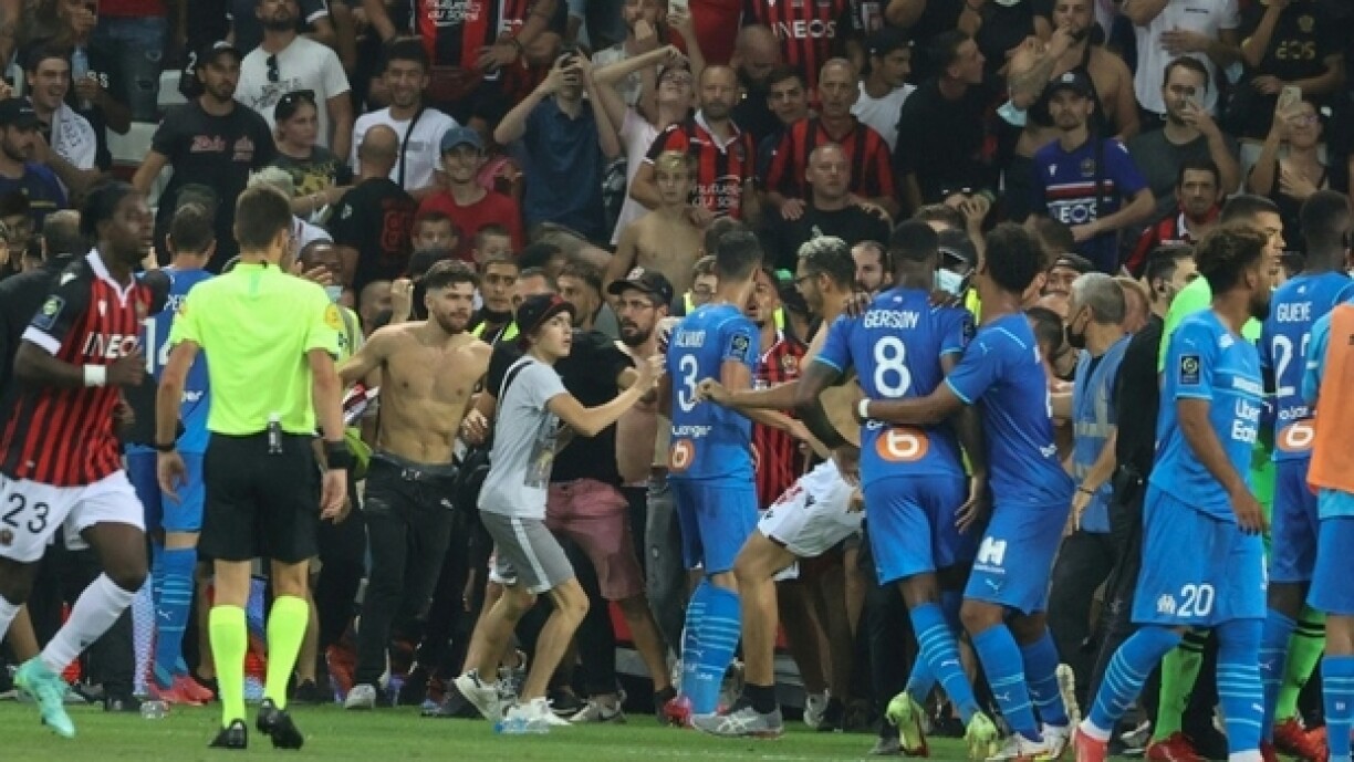 E Sonndegowend gouf de Match tëschent Nice a Marseille ofgebrach, nodeems 15 Minutte viru Schluss den Dimitri Payet vun enger Fläsch getraff gouf, déi vun den Zuschauer op den Terrain geheit gouf. Nodeems de fréiere franséischen Nationalspiller d’Fläsch dunn zeréck an de Block vun de Spectateure geheit huet, hu verschidde Supporter vun Nice den Terrain gestiermt an et ass zu Kläppereien tëschent Spiller a Supporter komm.