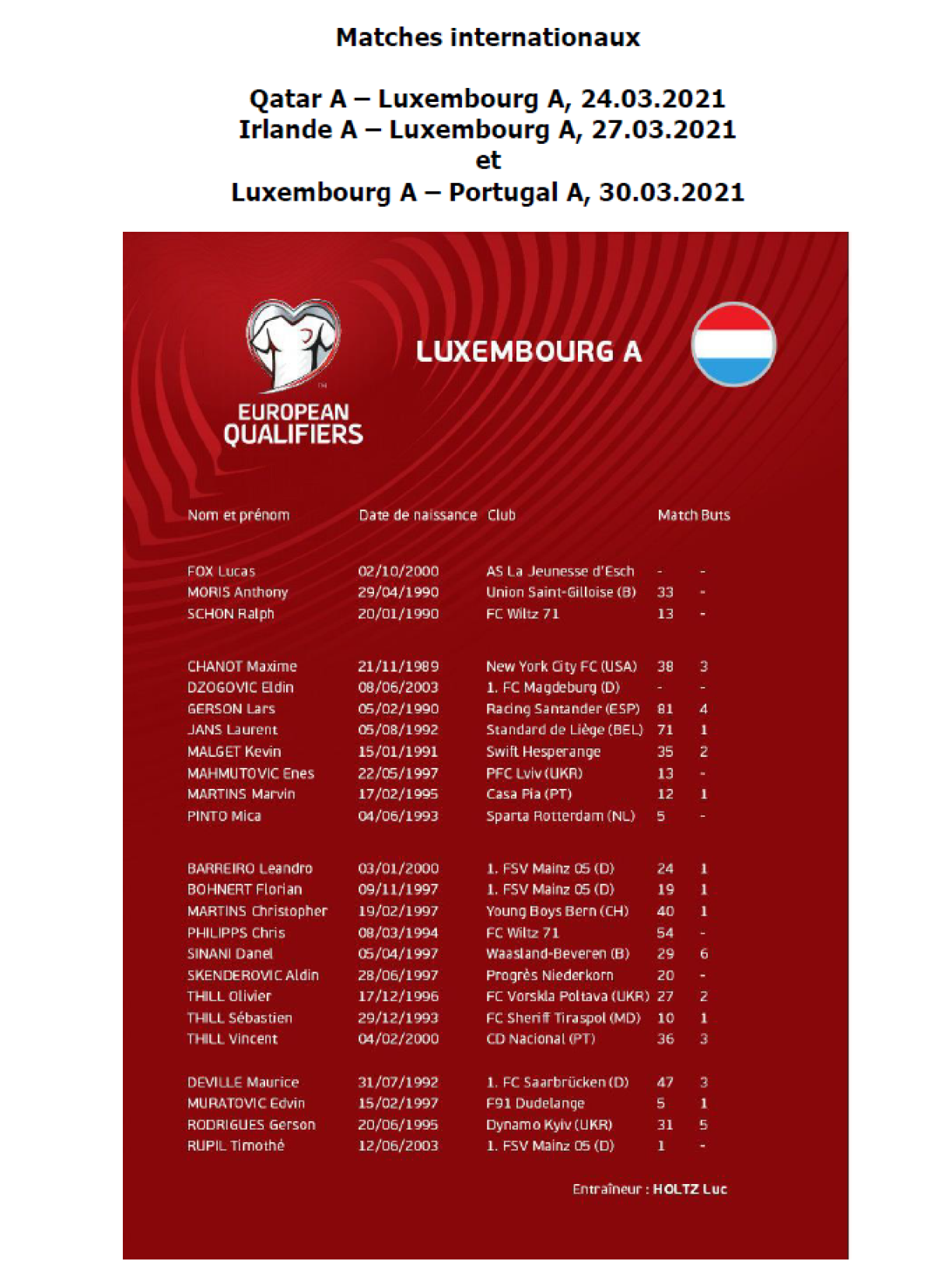 De Futtball-Nationaltrainer huet 24 Leit zeréckbehalen. Ënnert hinnen ass nees de Maxime Chanot. De Lëtzebuerger, deen an den USA spillt, huet säi lescht Match fir d’FLF-Formatioun am November 2019 gespillt. No senger Blessur ass och de Christopher Martins nees fit a gouf vum Luc Holtz zeréckbehalen. Fir d’éischte Kéier stinn de Lucas Fox an den Eldin Dzogovic am Kader.