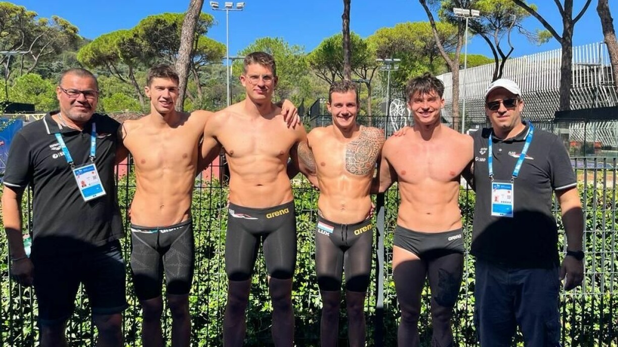 An der Staffel iwwer 4x100 Meter Crawl sinn de Rémi Fabiani, de Pit Brandenburger, de Max Mannes an de Julien Henx mat enger Zäit vun dräi Minutten, 20 Sekonnen an 92 Honnertstel een neie Lëtzebuerger Rekord geschwommen. Domadder ware si 72 Honnertstel méi séier wéi bei deem ale Rekord aus dem Joer 2021 a kommen op déi 14. Plaz ënnert 16 Ekippen.