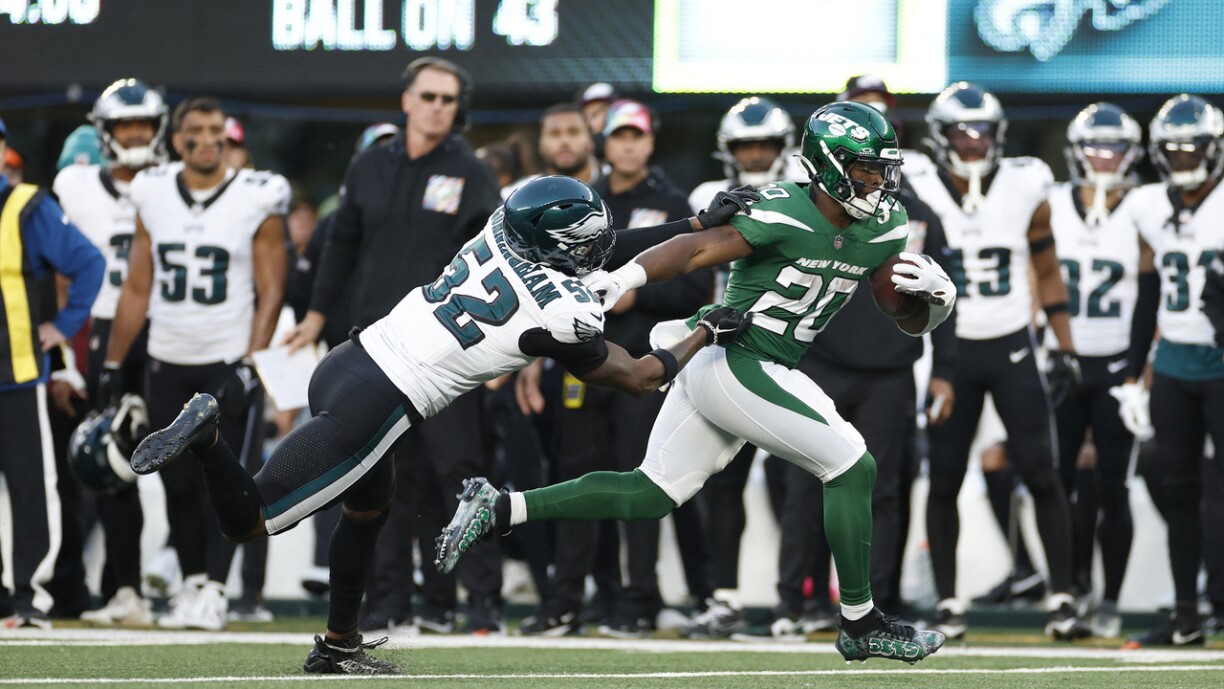 Mat fënnef Victoiren am Réck sinn d’Eagles op New York bei d’Jets gereest, déi bis ewell just zwou vun hire 5 Partië gewanne konnten. D’Eagles konnte sech zu engem Ament e 14:3-Avantage erausspillen, ma hir Offense, déi bis ewell staark opgetrueden ass, konnt keng Punkte méi op d’Board bréngen. Et war d’Defense vun den Jets, déi si zu Feeler gezwongen huet an hirer Ugrëffsekipp doduerch d’Aarbecht méi einfach konnt maachen. Mat just engem Touchdown a véier Fieldgoals geléngen hinnen 20 Punkten, wat duergaangen ass, fir dës Partie ze decidéieren.