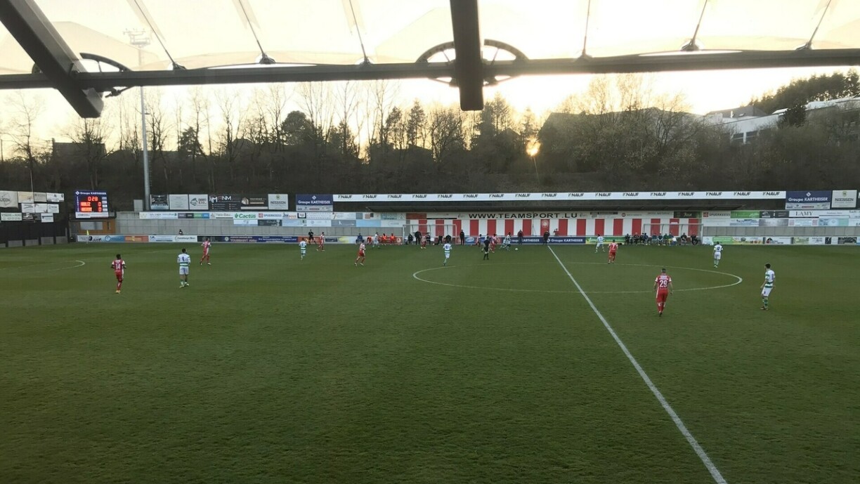 An den éischte Minutte konnt keng vu béiden Ekippen de Match u sech rappen, sou dass et eng ausgeglache Partie ouni vill Golchance war. No enger gudder hallwer Stonn ass de Shala dann am Strofraum zum Fale bruecht ginn, sou dass den Arbitter op Eelefmeter fir Nidderkuer entscheet huet. Den Hend ass ugetrueden a konnt d’Lokalekipp sou sécher a Féierung bréngen. Déi spilleresch Virdeeler waren éischter op der Säit vum Progrès an de Racing huet sech éischter op Konterattacke konzentréiert, konnt dovu bis zur Paus awer net genuch profitéieren.