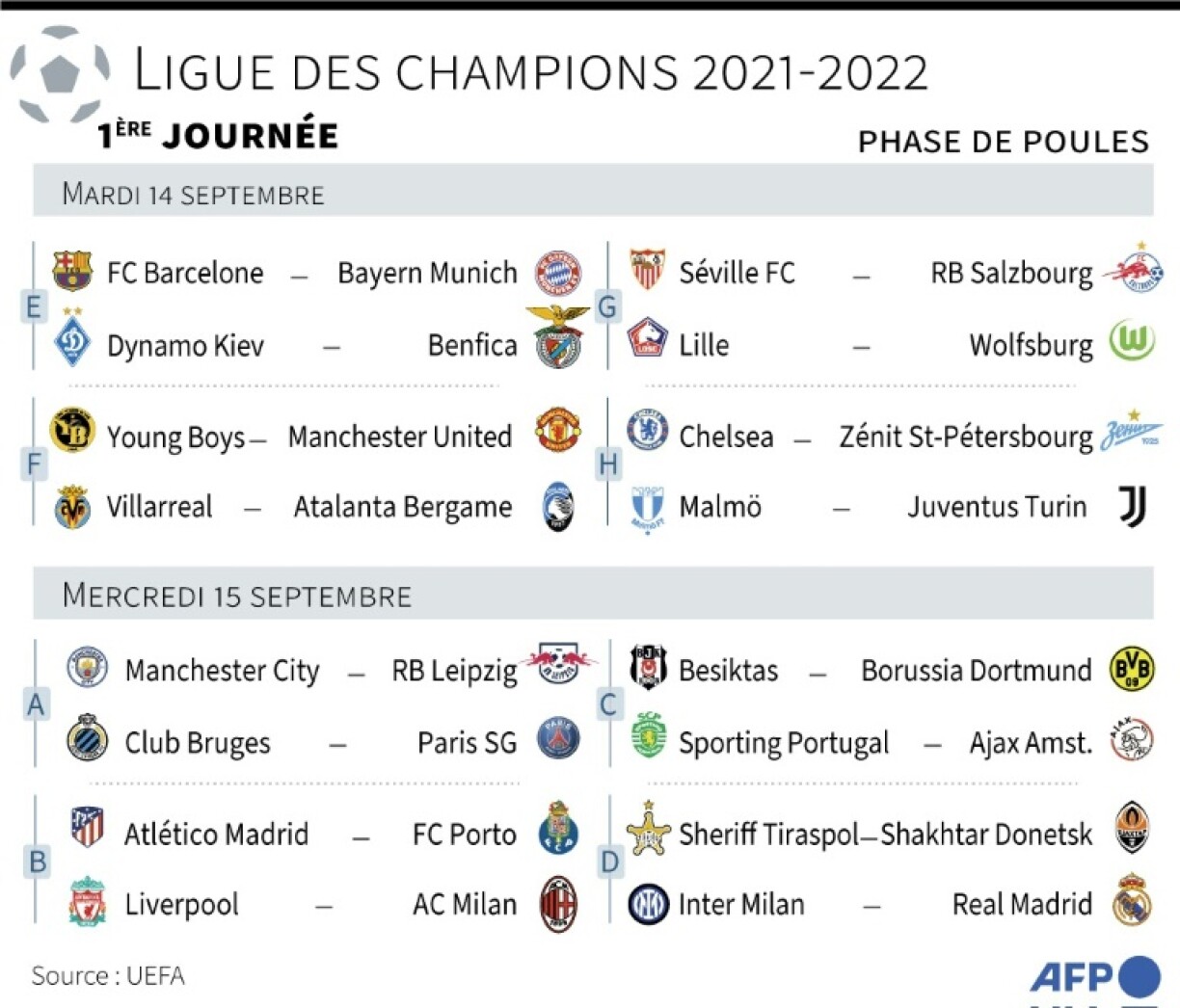 Aner Partien den Owend sinn nach Lille géint Wolfsburg, Chelsea géint St. Petersburg, Malmö géint d’Juve oder Villareal géint Bergamo.