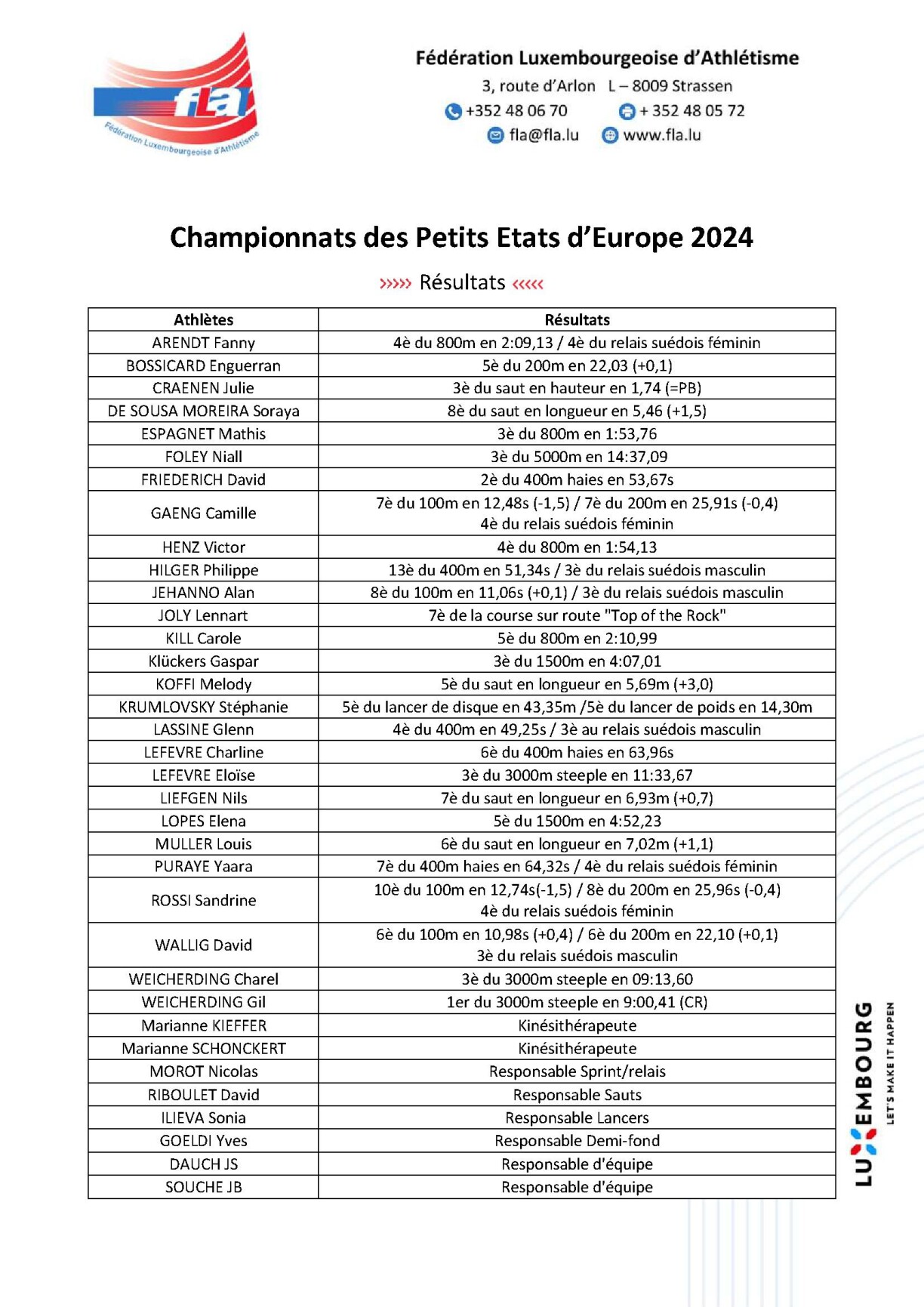 Nieft enger Rei gudde Placéierunge sollt fir d’Rout Léiwen och déi eng oder aner Medail eraussprangen. De Gil Weicherding huet iwwer 3000 Meter Hindernis Gold gewonnen, den David Friederich krut iwwer 400 Meter Hecke Sëlwer, a fir Gaspar Klückers, d’Julie Craenen, d’Eloïse Lefevre, de Charel Weicherding, de Mathis Espagnet an de Niall Foley gouf et jeeweils Bronze.