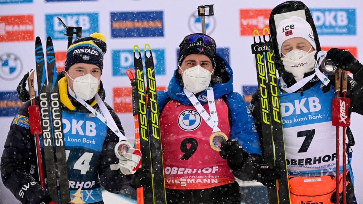 Zum Ofschloss vum Weltcup zu Oberhof gewënnt de Leader am Gesamtweltcup Quentin Fillon Maillet an der Poursuite virum Sebastian Samuelsson aus Schweden an dem norweegesche Routinier Tarjei Bö. De Maillet huet sech just zwee Feeler beim Schéissen erlaabt an ass mat engem Virsprong vu knapp 10 Sekonne virum Samuelsson a 15,6 Sekonne virum Bö iwwer d’Arrivée gefuer.