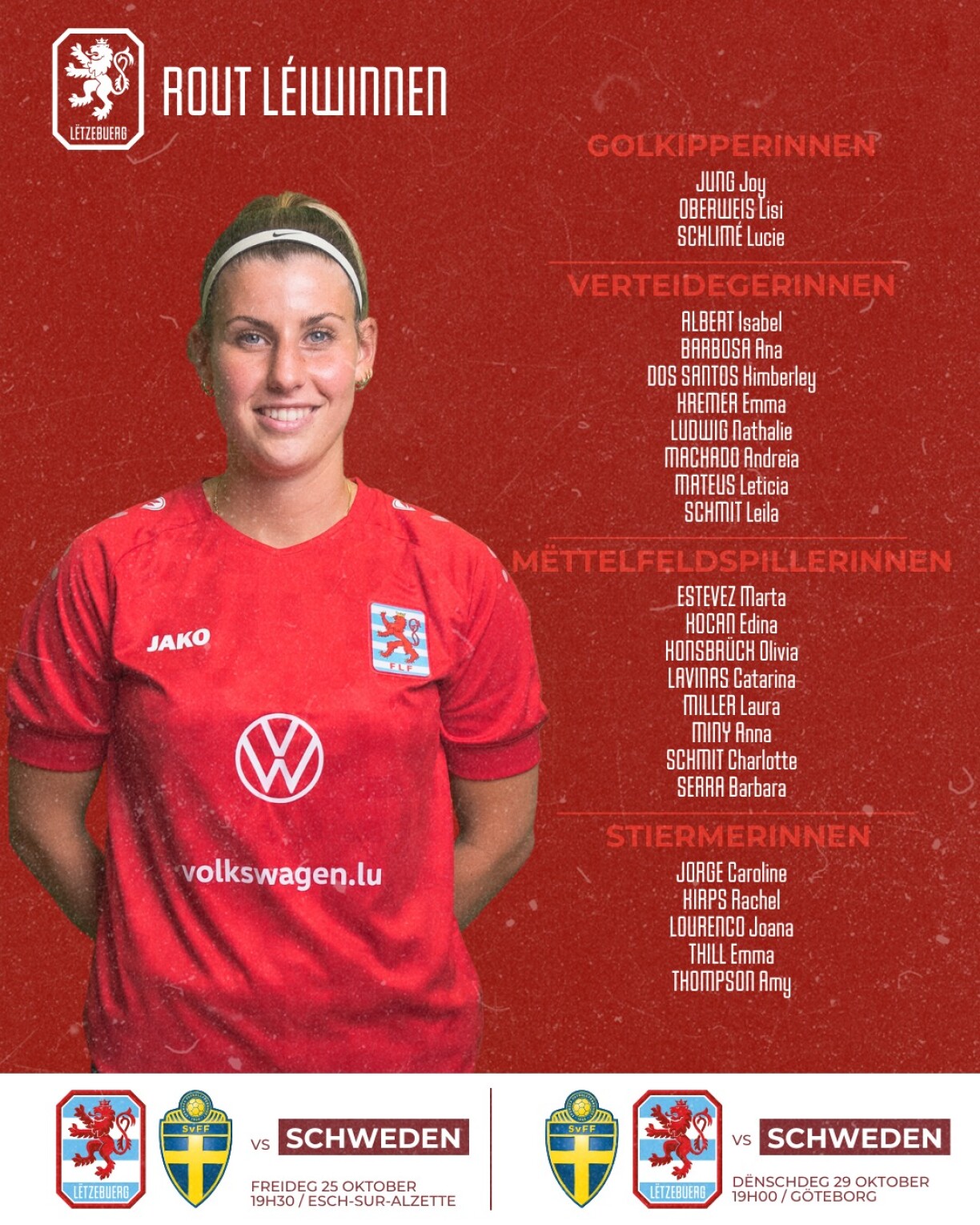 De 25. an 29. Oktober spillt d’Ekipp vum Dan Santos géint Schweden, d‘Nummer 5 an der FIFA-Weltranglëscht. Grouss Iwwerraschungen am Kader goufen et keng. Nei mat dobäi sinn ënner anerem d’Barbara Serra an d’Emma Thill.
