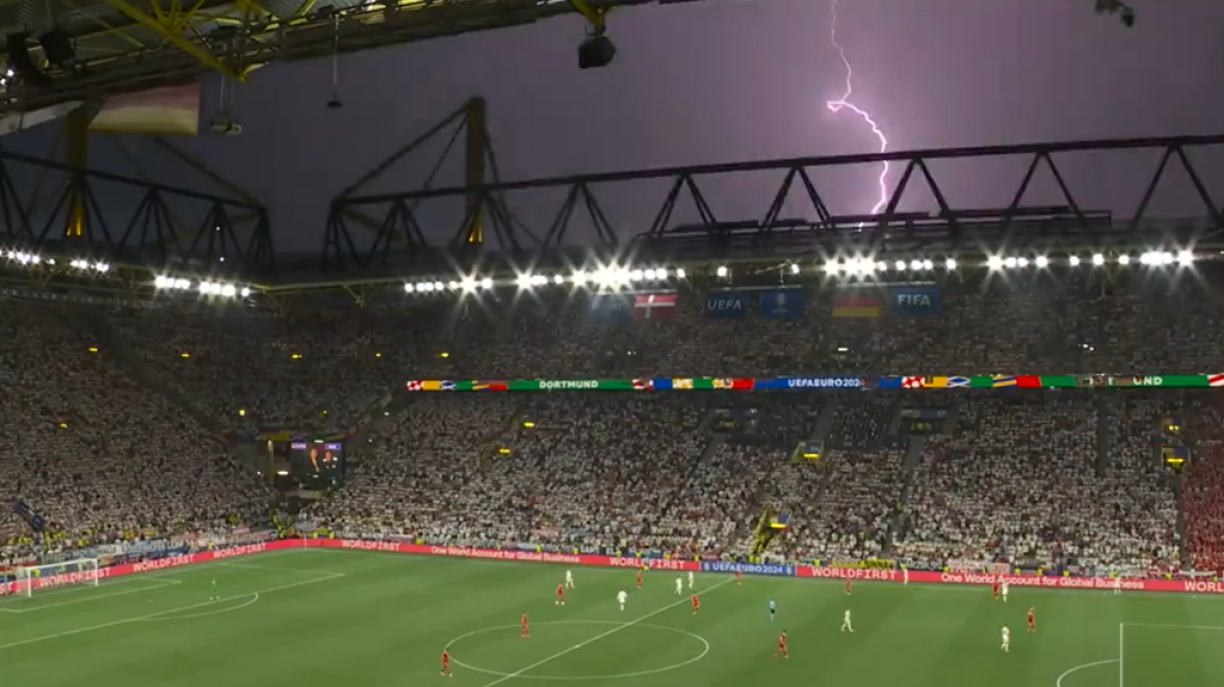 De Match am Dortmunder Westfalenstadion hat direkt mat engem Gol vum Schlotterbeck an der 4. Minutt ugefaangen, mee de Gol gouf wéinst Foulspill am Virfeld oferkannt. Och an de Minutten duerno ass Däitschland ugerannt an hat no 7 an no 10 Minutten déi nächst héichkaräteg Chancen, mee de Schmeichel konnt jeeweils ofwieren. Ab der 20. Minutt huet Dänemark ëmmer méi d’Kontroll vum Match iwwerholl a koum och zu gudde Chancen. An der 35. Minutt gouf de Match no engem Blëtzschlag iwwer dem Stadion a Ree mat Knëppelsteng ënnerbrach.