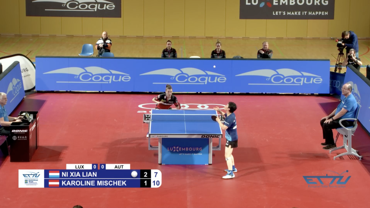 Am Gymnase vun der Coque hunn d‘FLTT-Damme géint Éisträich missen untrieden. Och wa sech am Viraus eng spannend Partie annoncéiert huet, esou war den éischte Simple direkt schonns iwwerraschend knapp. Hei konnt sech d‘Ni Xia Lian (WR 42) knapps mat 3:2 géint d‘Karoline Mischek (WR 187) duerchsetzen.