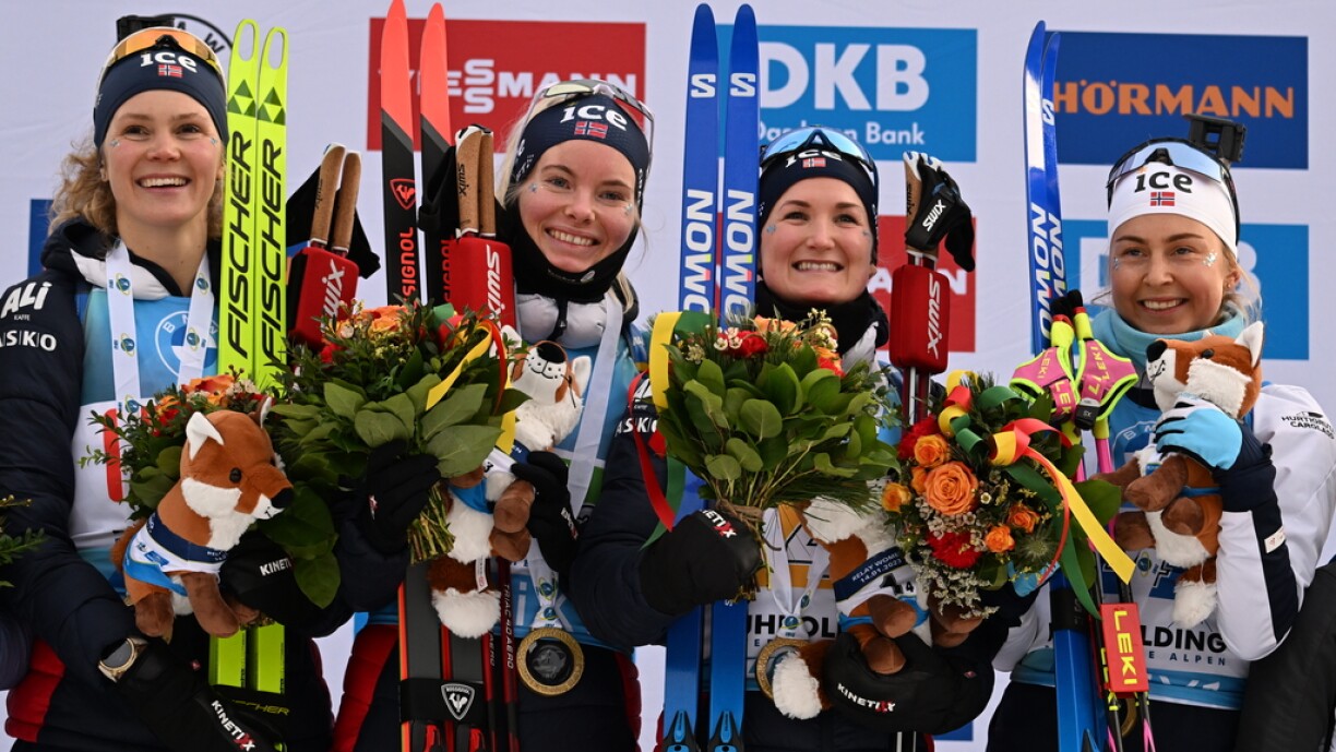 Bei den Damme koum Norwegen an der Staffel iwwer 4 Mol 6 Kilometer mat der beschter Zäit a just sechs Schéissfeeler an d’Zil. Plaz zwee goung un d’Heemekipp aus Däitschland (+ 15,30 Sekonnen), dat zwar zéng Schéissfeeler hat, awer eng eng besser Performance am Lafe gewisen huet wéi Italieenerinnen op Plaz dräi (+ 33,50). Déi däitsch Dammen hunn domat dat selwecht Resultat erreecht, wéi hir männlech Kolleegen um Virdag. De Réckstand vun der Schwäiz op eng Podiumsplaz war minim (+ 36,30), d’Avance op Tschechien (+57,60) op Plaz fënnef awer komfortabel.