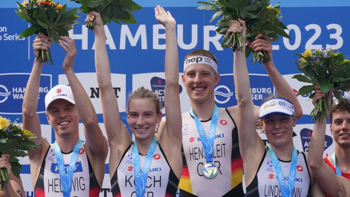 D’Victoire bei der gemëschter Staffel war um Enn fir déi däitsch Staffel, déi mat enger Zäit vun 1 Stonn, 22 Minutten an 8 Sekonnen déi séierst war. Bei dësem Format mussen déi 4 Triathleten jeeweils 300 Meter schwammen, 7 Kilometer Vëlo fueren an 1,7 Kilometer lafen. Déi neuseelännesch Staffel ass mat engem Retard vun 19 Sekonnen op déi zweet Plaz komm, wärend d’Schwäizer Triathleten et och op de Podium gepackt hunn (1:22:35).