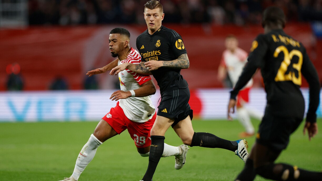 Leipzig huet de Kapp awer net hänke gelooss an hätt zwou Minutte méi spéit missen ausgläichen. Den Olmo huet awer net placéiert genuch ofgeschloss, soudass de Lunin paréiere konnt. D’Heemekipp huet weider alles ginn, war awer net präzis an de Ofschlëss. Real huet just nach dat Néidegst gemaach, stoung hanne kompakt an huet op Kontere gelauert. An der 71. Minutt goung dem Vinicius säi Schoss op de Potto. Eng Véierelsstonn viru Schluss huet Leipzig mat engem dräifache Wiessel probéiert, den Drock op Real héich ze halen. D’Ekipp vum Marco Rose konnt sech ëmmer nees schéin no vir kombinéieren, de leschte Ball ass awer net ukomm. An der 80. Minutt hätt souwuel de Xavi wéi och de Sesko missen ausgläichen, de Lunin huet awer zweemol eng gutt Parad gewisen. An der hektescher Schlussphas ass et just nach a Richtung vum spuenesche Gol gaangen. Real huet dem Drock awer Stand gehalen a sech um Enn mat 1:0 duerchgesat.