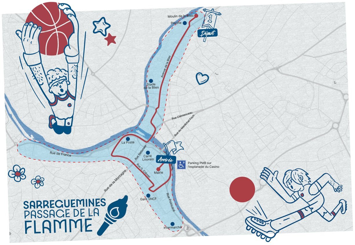 No Meisenthal mécht sech d’Olympesch Flam op de Wee a Richtung Sarreguemines, wou de Passage tëscht 9.04 Auer an an 10.04 Auer geplangt ass. Fort geet déi 3,7 Kilometer laang Streck virum “Moulin de la Biles um 9.15 Auer”, éier se virun der Gemeng ukënnt.