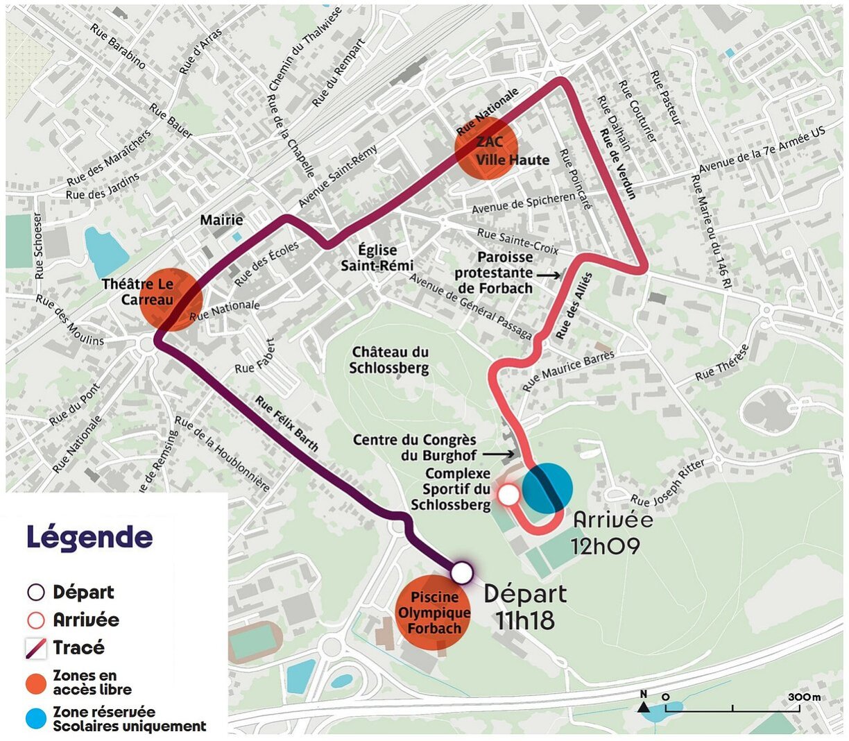 Zu Forbach passéiert d’Flam da viraussiichtlech tëscht 11.18 an 12.09 Auer. De ganzen Dag sinn hei Animatiounen, sportlech Aktivitéiten a Concerten an der Gemeng geplangt.