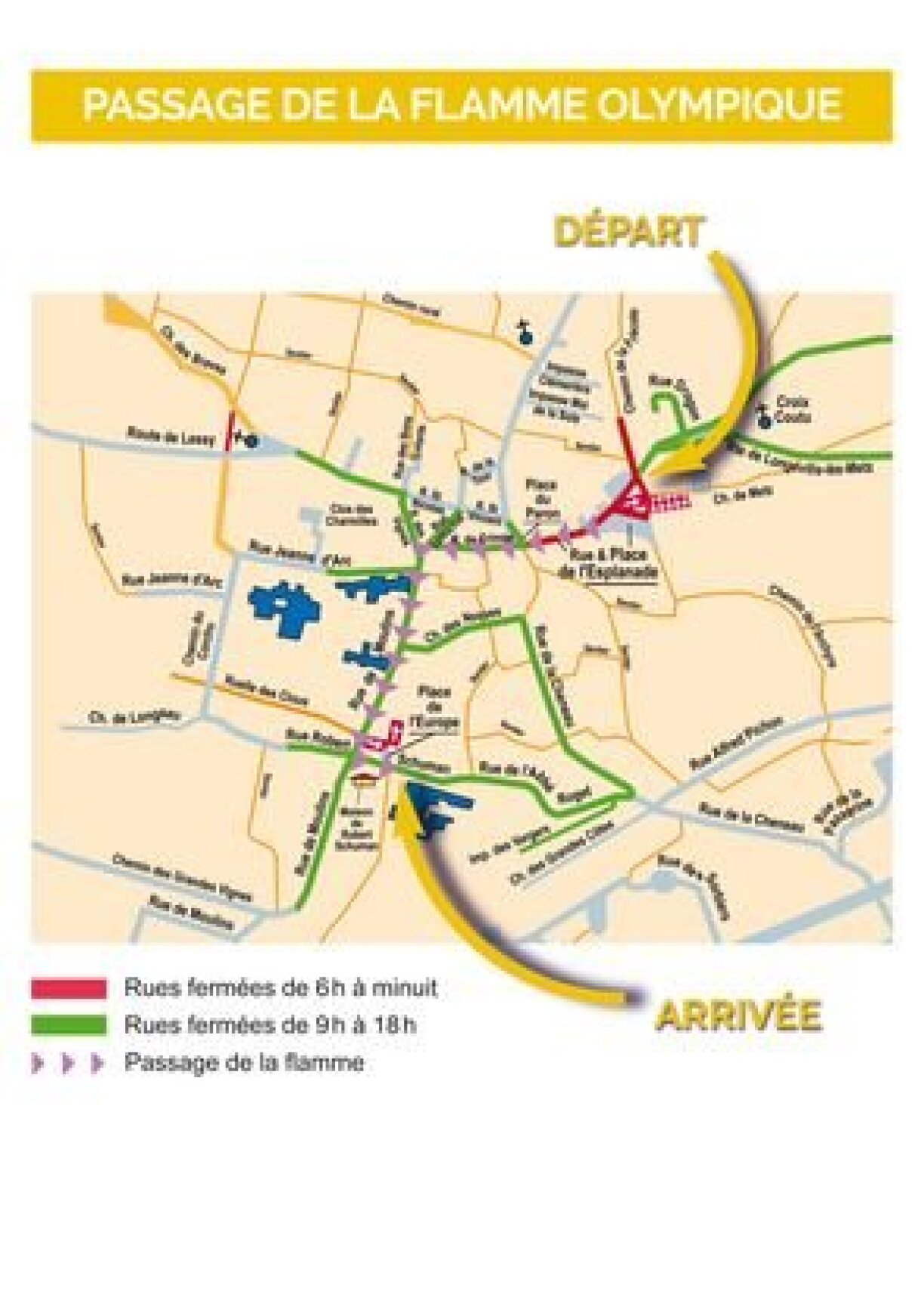 Déi lescht a wichtegst Etapp vun der Olympesche Flam en Donneschdeg geet duerch den Zentrum vu Metz. Hei gëtt d’Fakel tëscht 17.56 an 19.20 Auer vun den “Arènes de Metz” iwwer d’Gare an d’Oper bis op d’Place de la République gedroen.